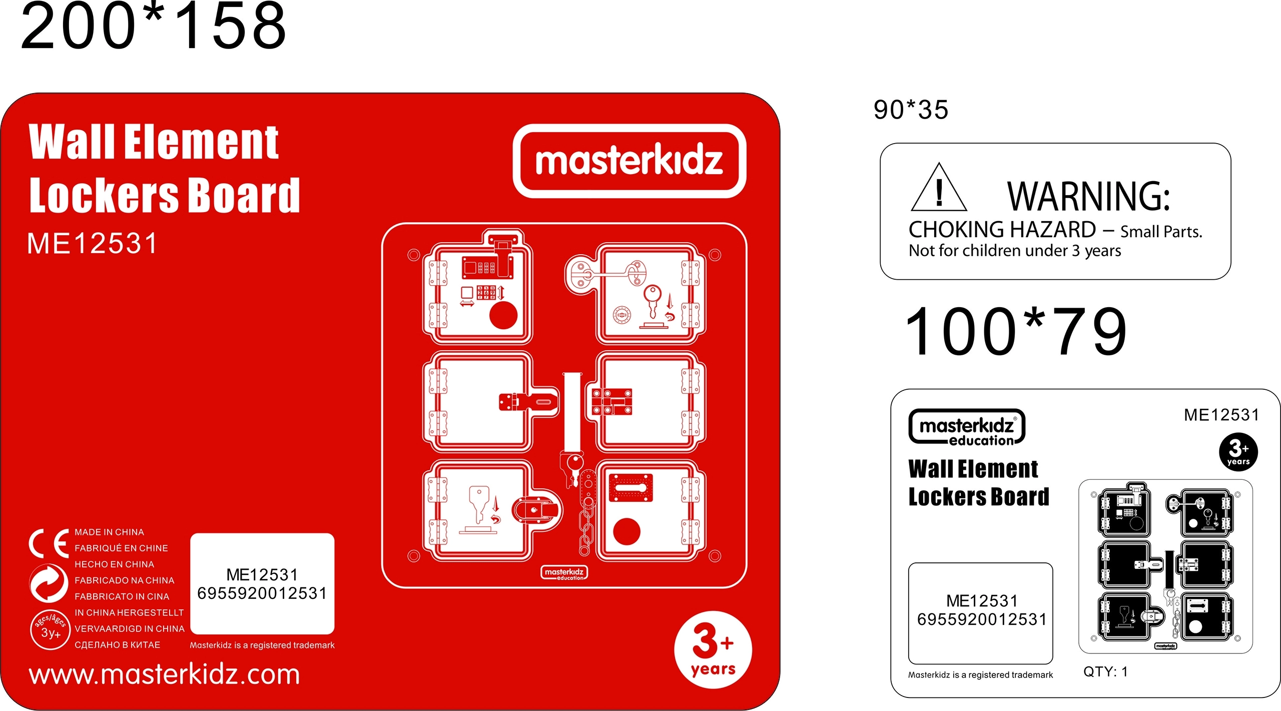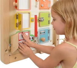 Открийте забавен начин децата да се учат на отваряне и затваряне на ключалки. Дървената стенна табела MASTERKIDZ с 6 „сейфа“ развива фината моторика, координацията око–ръка и логическото мислене. Здрава изработка, сухоизтриваеми вътрешни страни на вратичките и възможности за монтаж на стена, в MASTERKIDZ Flex или на самостоятелна стойка правят таблата идеален помощник за детски градини, игрални зони и дома.
