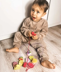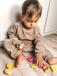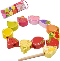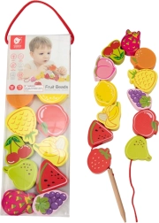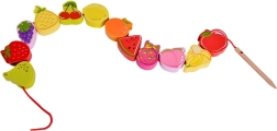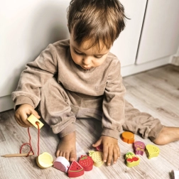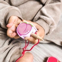Този дървен нанизващ комплект с мотив плодове е идеален помощник за малки изследователи от 18 месеца. Децата с помощта на дървената игла нанизват отделните цветни плодове на връв, като по естествен начин развиват фината моторика, търпението и логическото мислене. Едновременно с това по забавен начин научават цветовете и имената на плодовете.