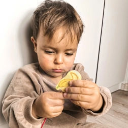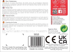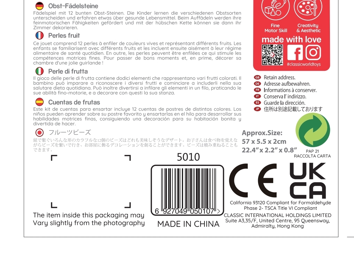 Компонентите са изработени от качествено лакирано дърво и са боядисани с безопасни, нетоксични бои. Комплектът е устойчив, приятен на допир и насърчава креативната и отворената игра – мънистата могат да се подреждат в произволен ред и да се създават собствени „плодови герданчета“.