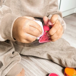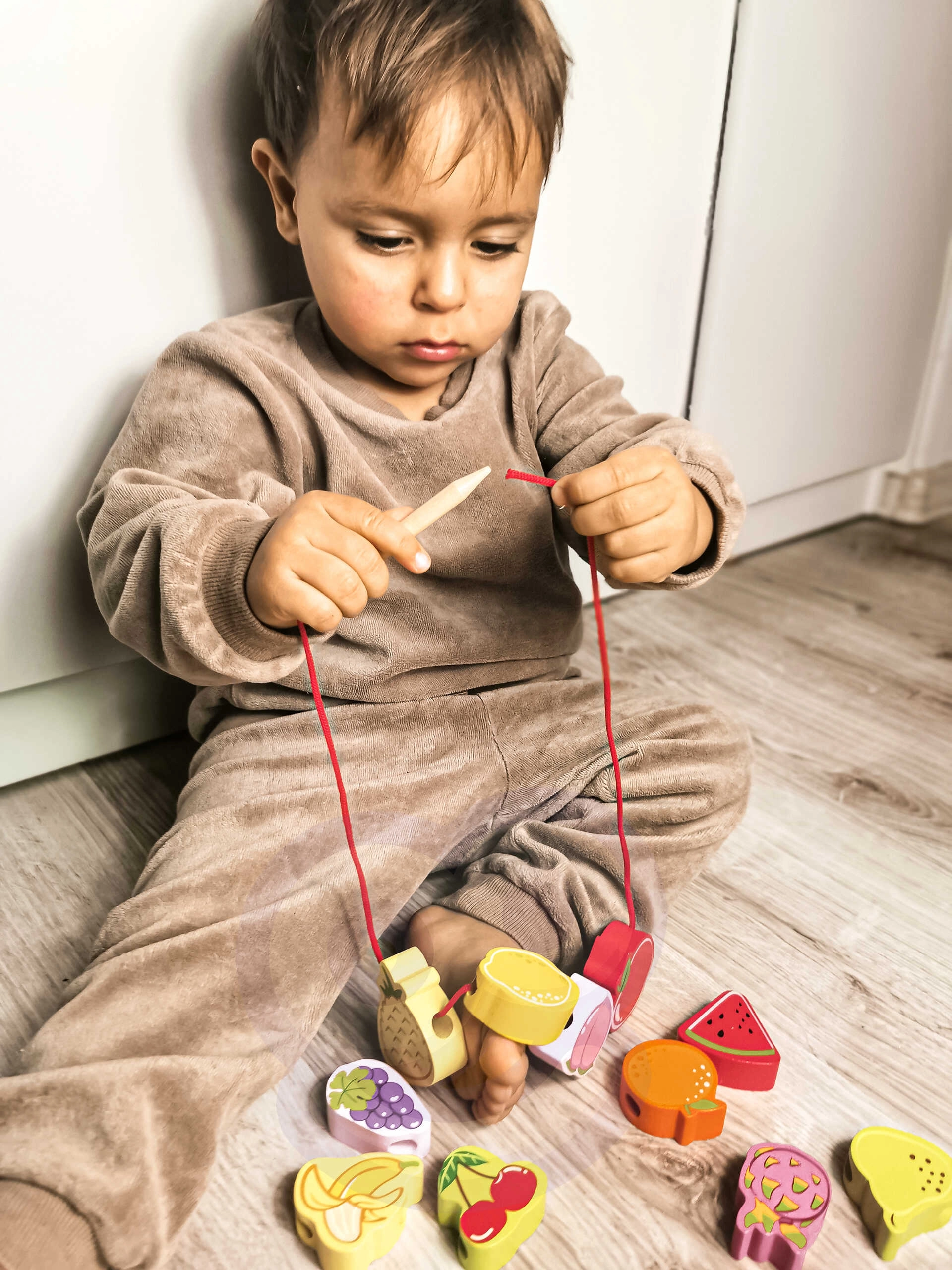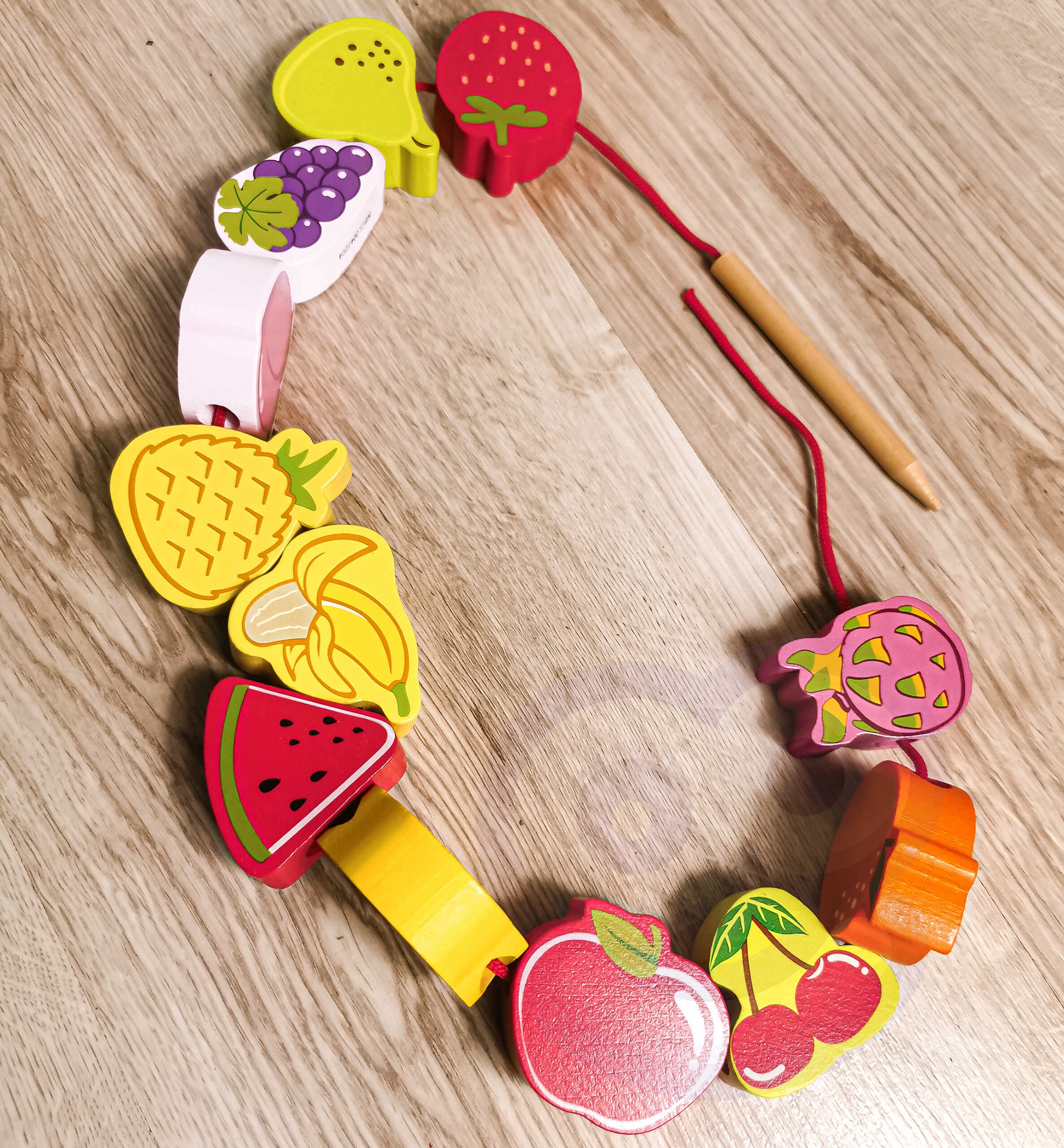 Нанизването на плодовите мъниста на връв с дървена игла естествено тренира захвата, точността на движенията и координацията око–ръка.