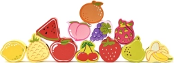 Сетът съдържа пъстри форми на ягода, банан, грозде и други плодове. Децата по време на игра се учат да разпознават цветовете и имената на плодовете.
