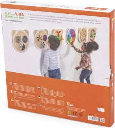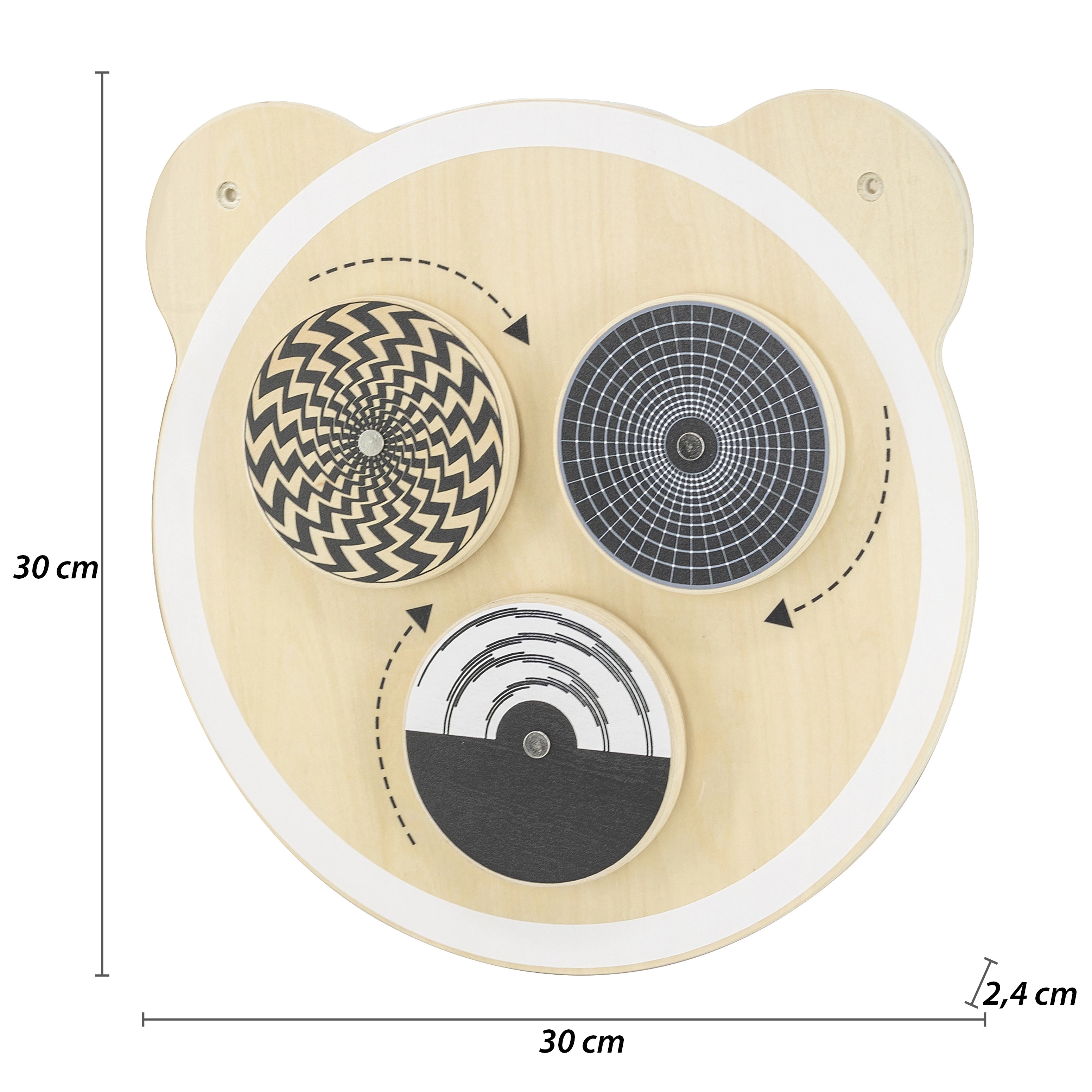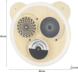 Дървената стенна дъска с мотив на мечка е идеална за развитие на логическото мислене и въображението на децата. Съдържа три кръгови елемента, които при въртене създават оптични илюзии, и е боядисана с нетоксични бои в ярки нюанси. Тази играчка ще зарадва всяко дете и е подходяща както за дома, така и за учебни заведения.