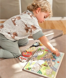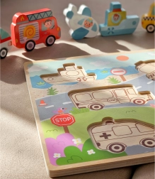 Тази дървена Монтесори вкача носи на децата забавно учене чрез игра. Комплектът включва стабилна дъска с изрези и 7 части превозни средства (напр. кола, такси, полиция, линейка, пожарна, самолет, лодка), които децата съотнасят по форма и картинка. Благодарение на ярките цветове и ясните контури децата бързо разбират принципа на съотнасяне и с всяка правилно поставена част изпитват чувство за успех.