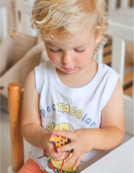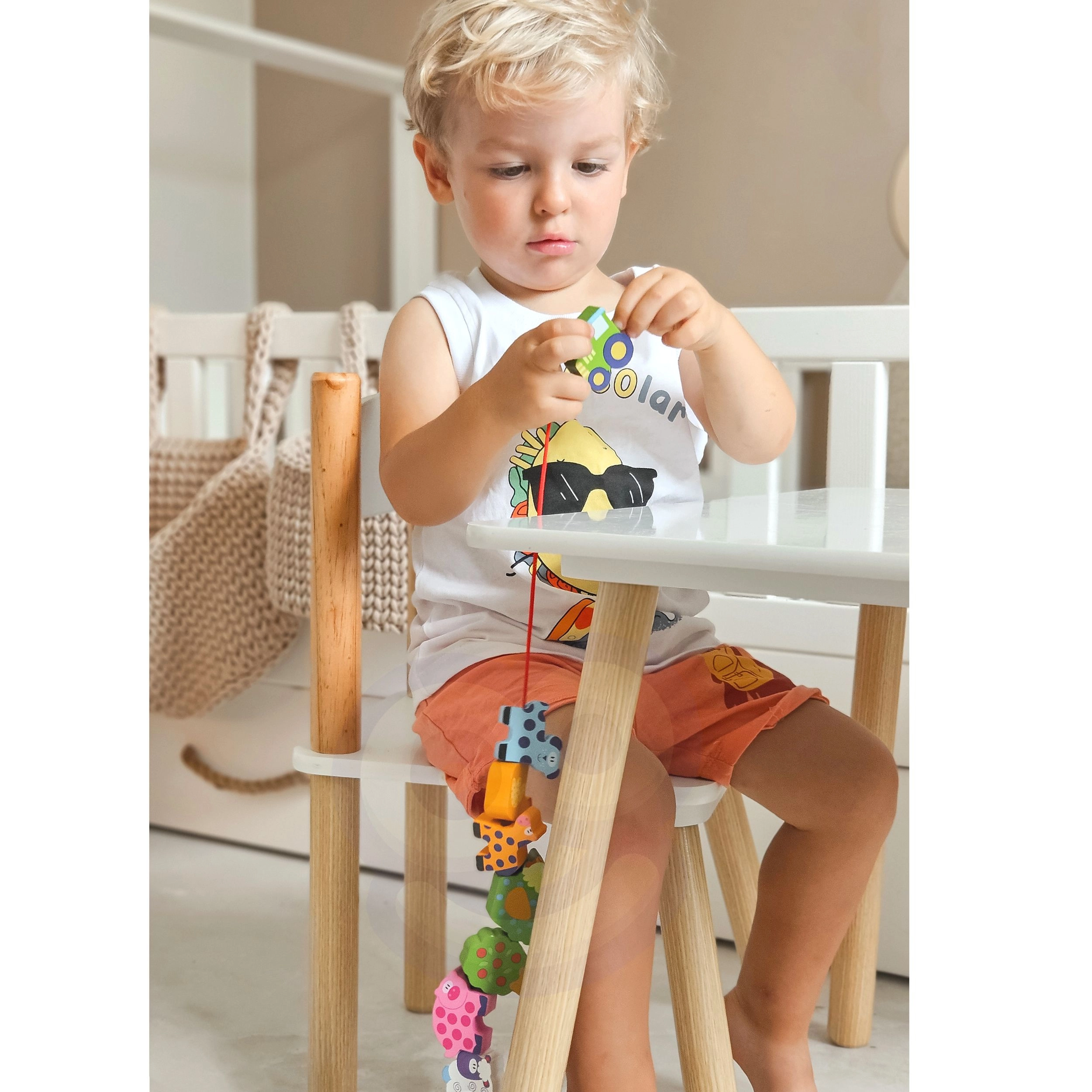 Прокарването на връвчицата през дървените елементи учи децата на прецизни движения на пръстите и подобрява координацията око–ръка. Забава, която естествено развива уменията.