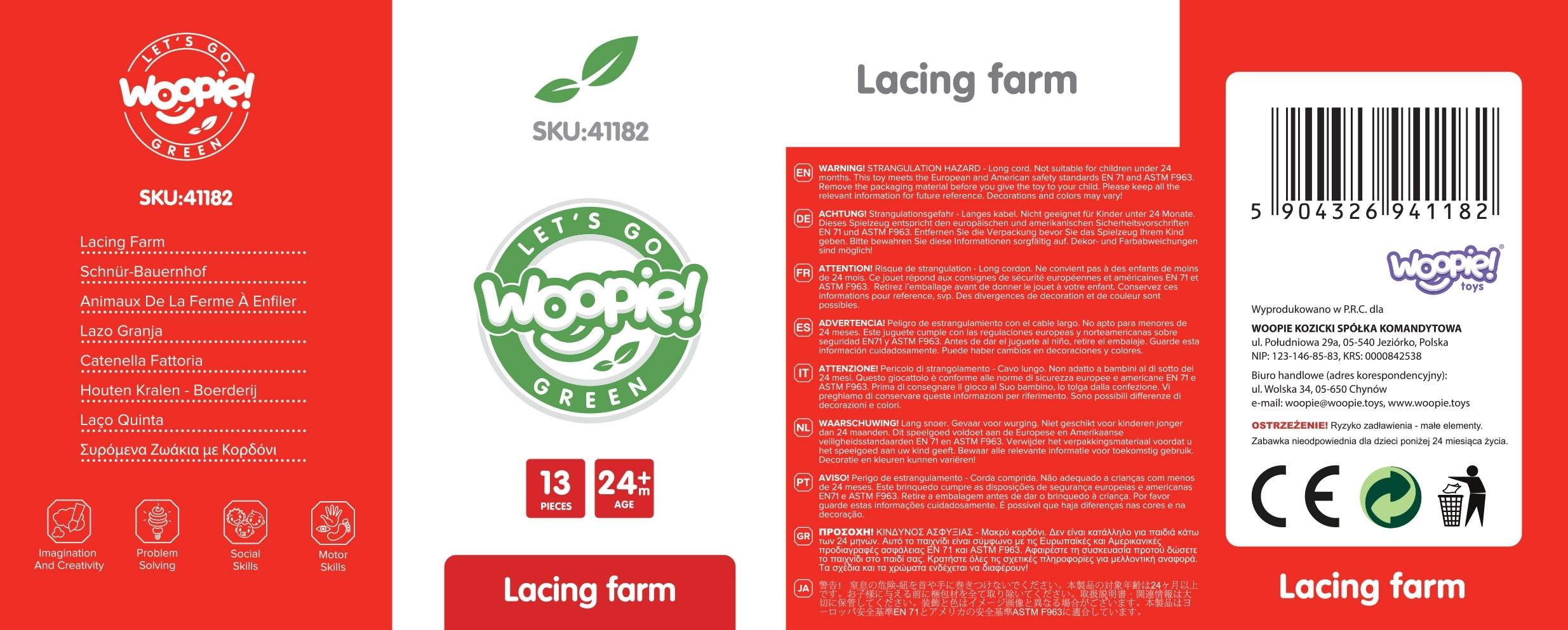 Открийте чара на фермата с дървения нанизващ комплект WOOPIE GREEN. Децата нанизват цветни елементи – кравичка, трактор, плевня, конче, овчица, ограда, кокошка, петел, бали сено и други – на връвчицата и така тренират прецизността на пръстите и координацията око–ръка. Естественото дърво и нетоксичните бои осигуряват безопасна игра, която същевременно щади околната среда.