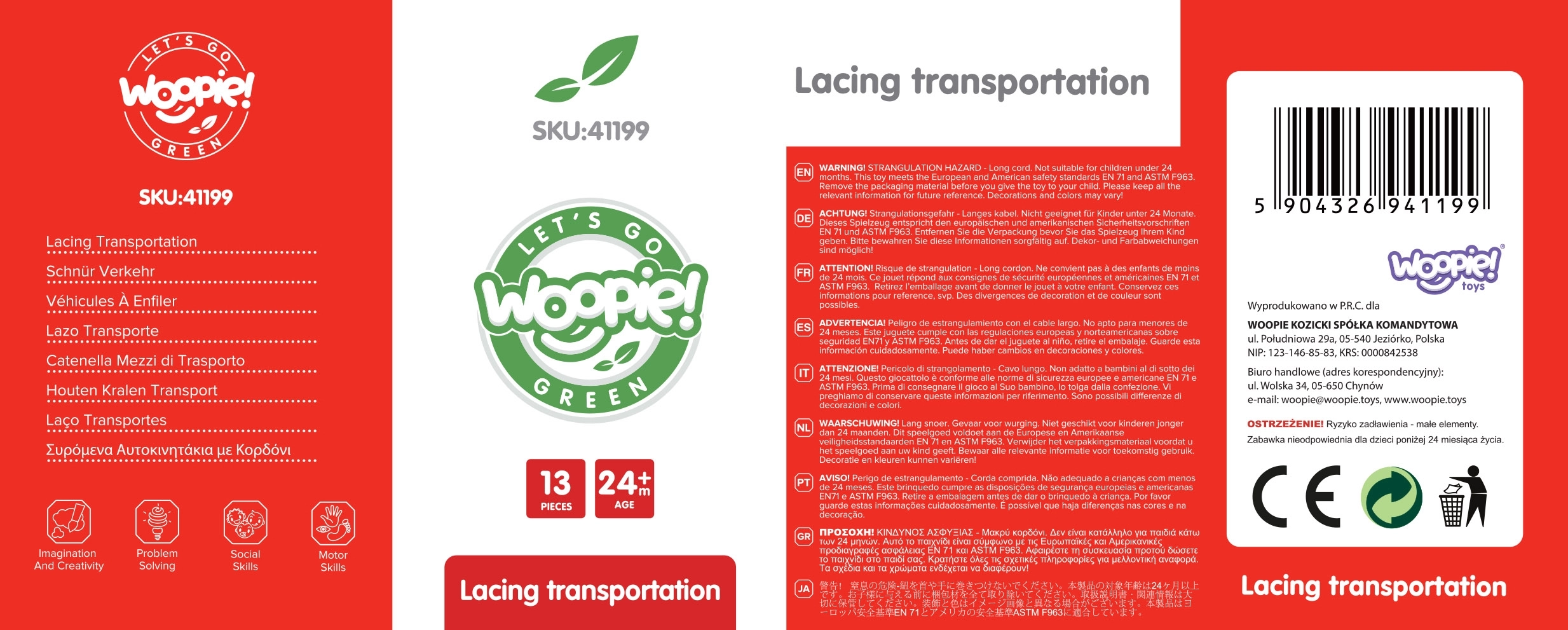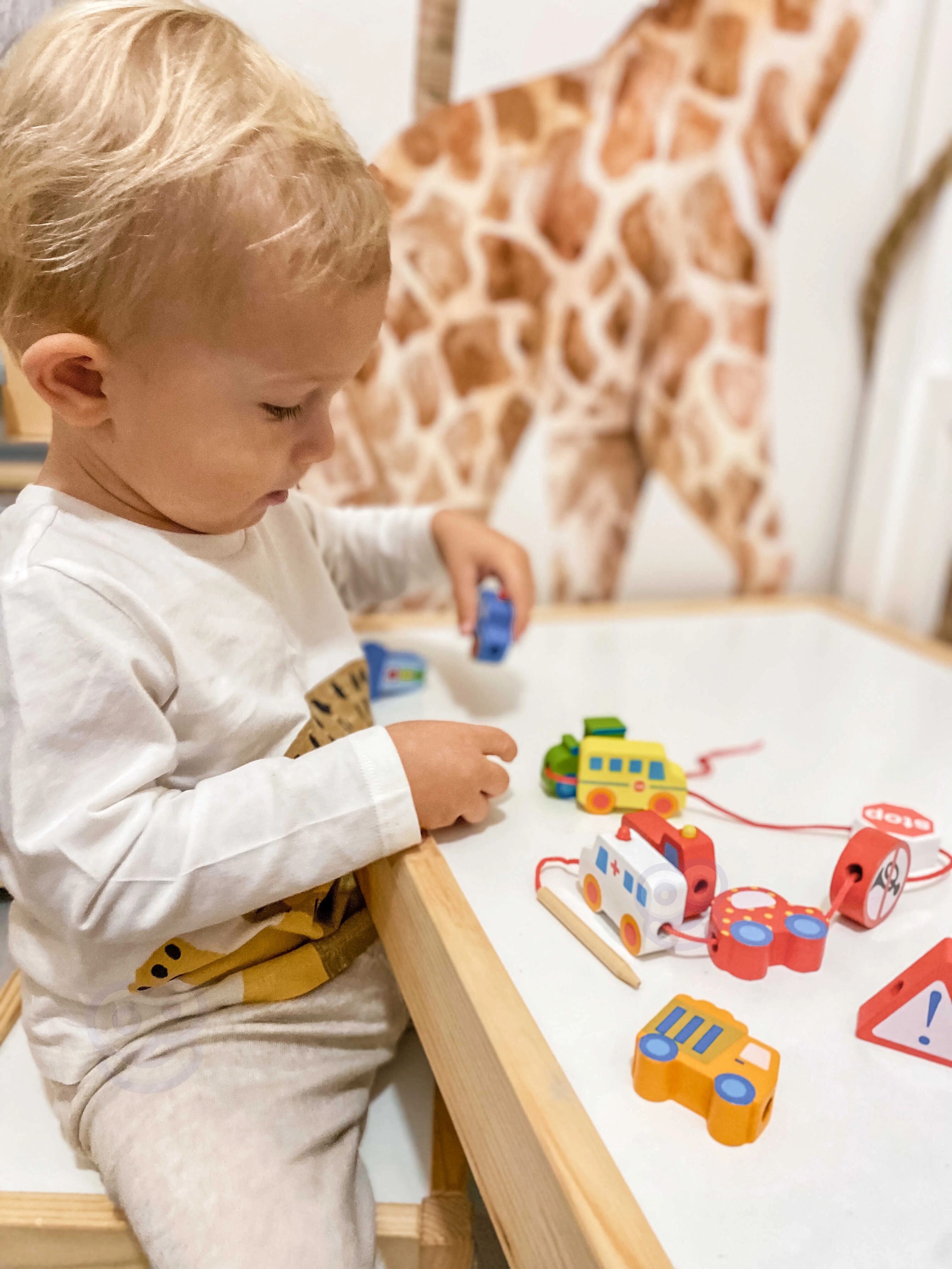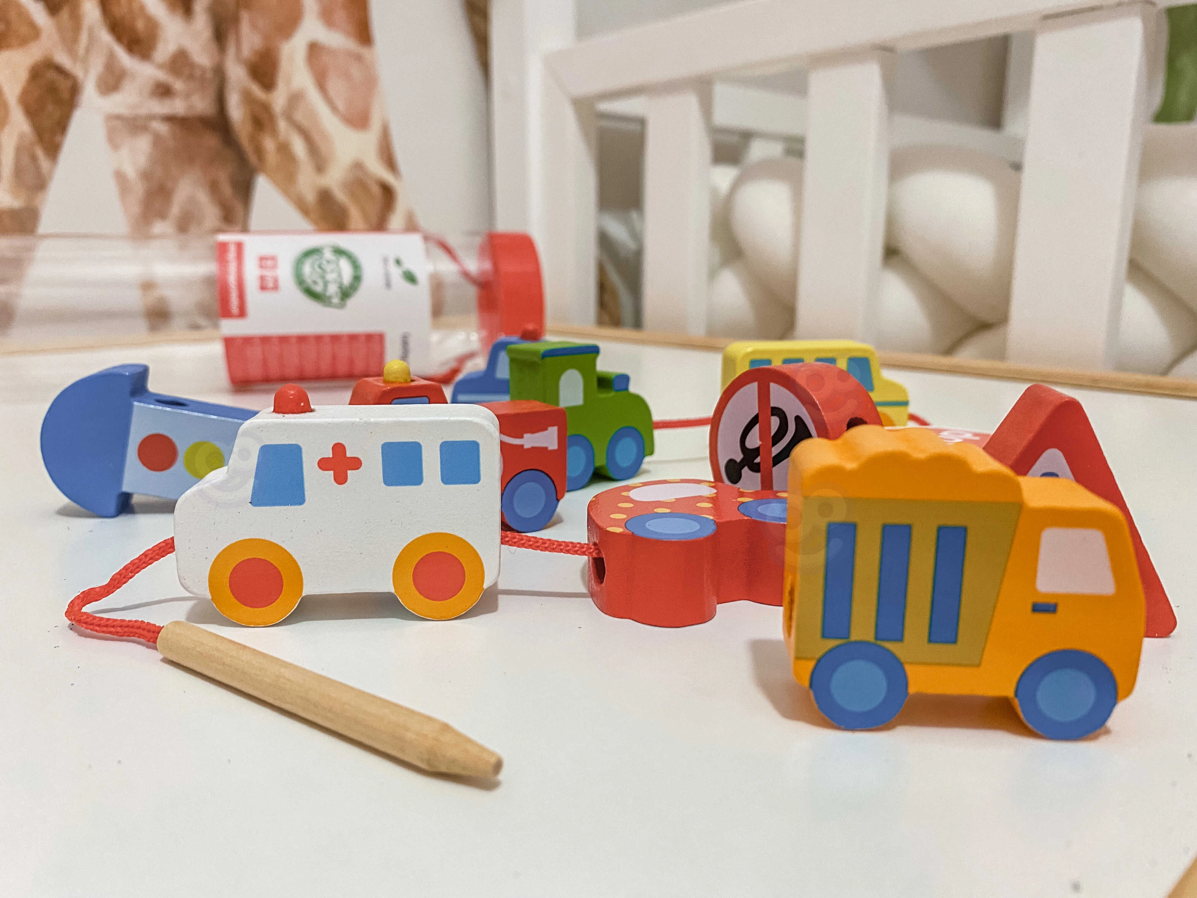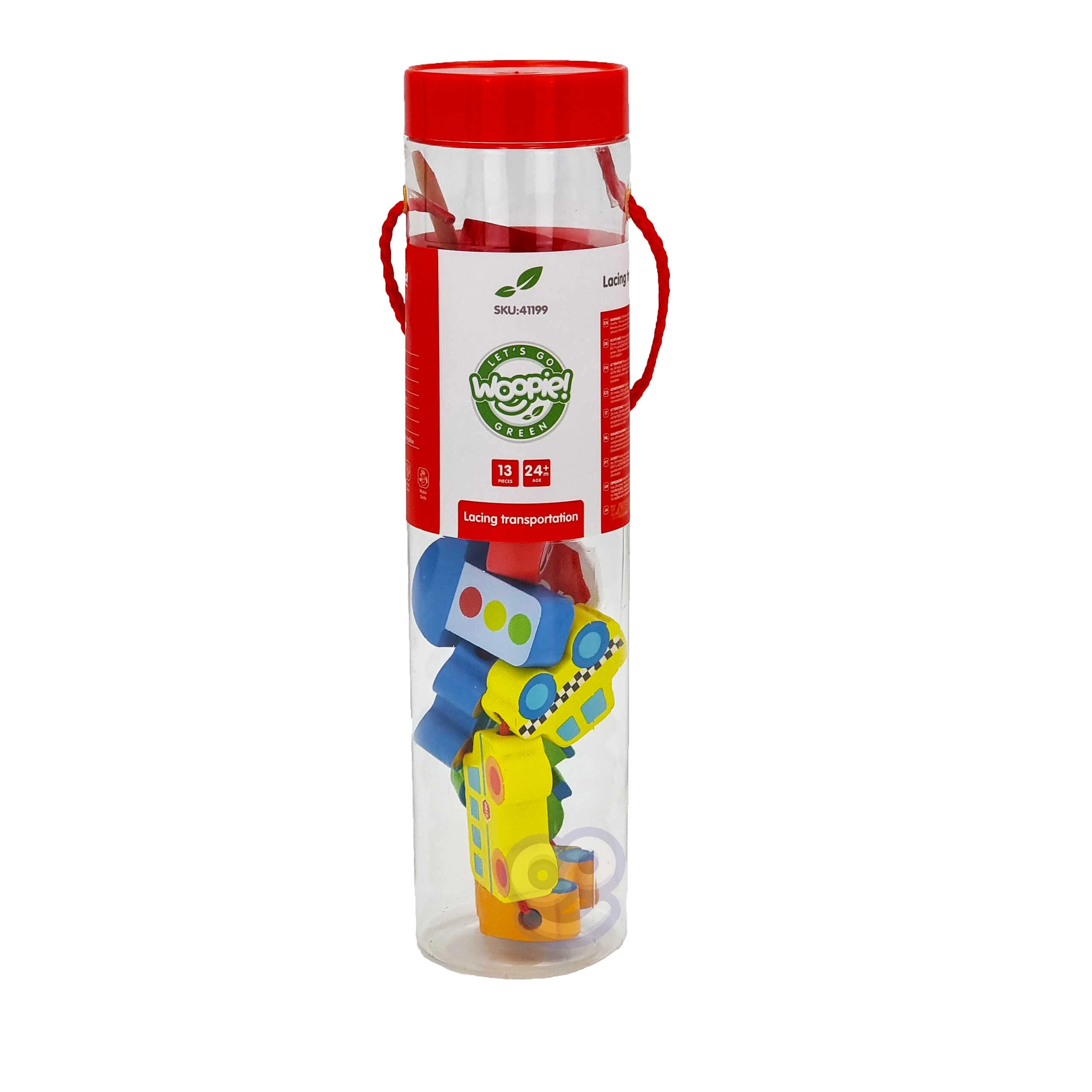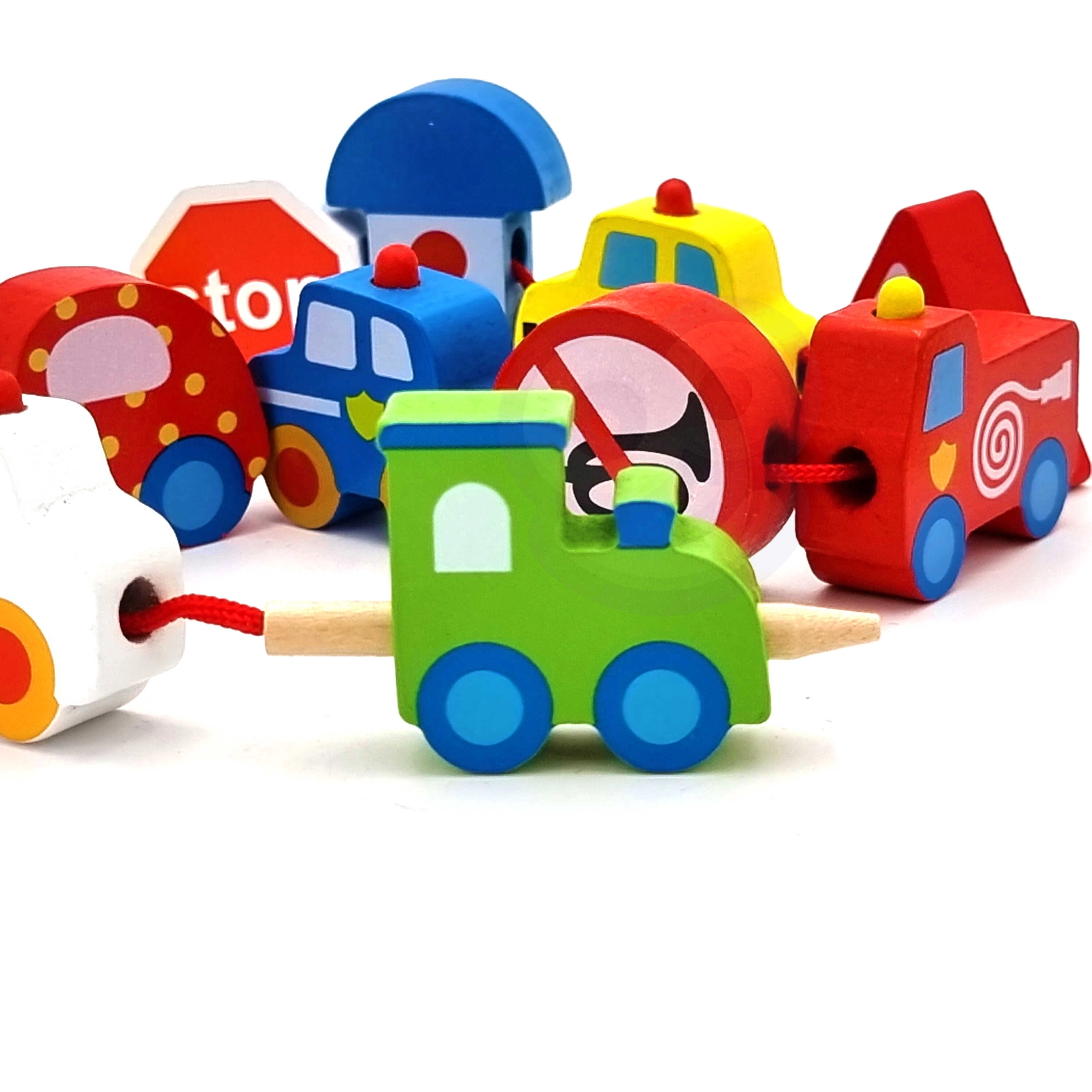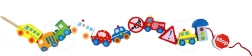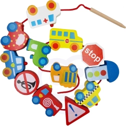 В комплекта има 12 дървени кубчета с мотиви на превозни средства и 1 връвчица с дървена пръчица за лесно промушване. Чрез нанизване на елементите могат да се създават собствени „колони“ или градски истории – от пожарна кола през полицейски автомобил до автобус и пътни знаци.