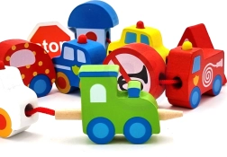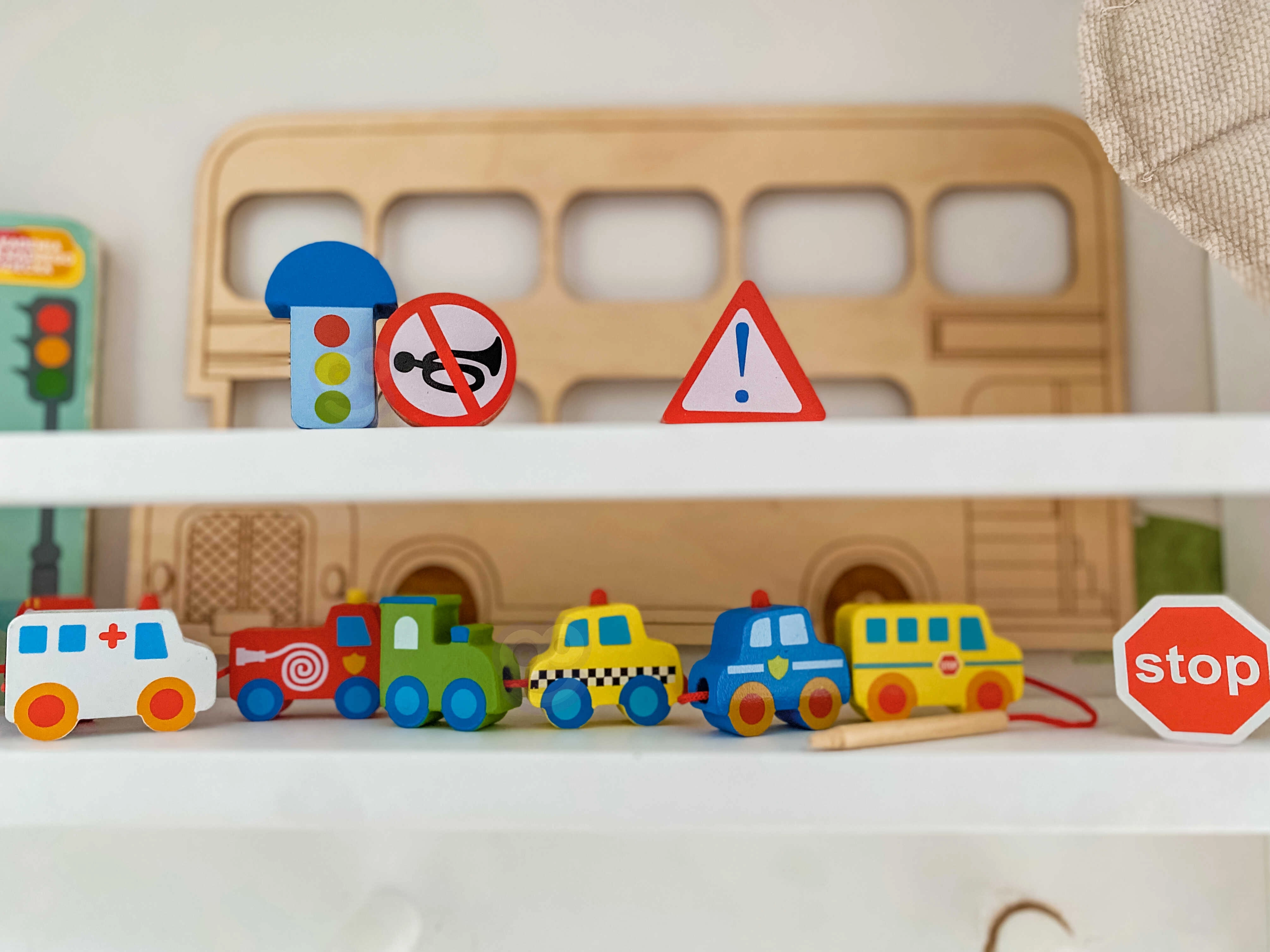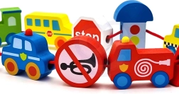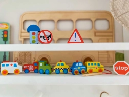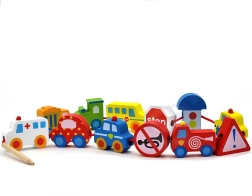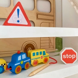 Цветните дървени елементи изобразяват коли, автобус, трактор, линейка и пътни знаци – децата по забавен начин се запознават със света на транспорта.