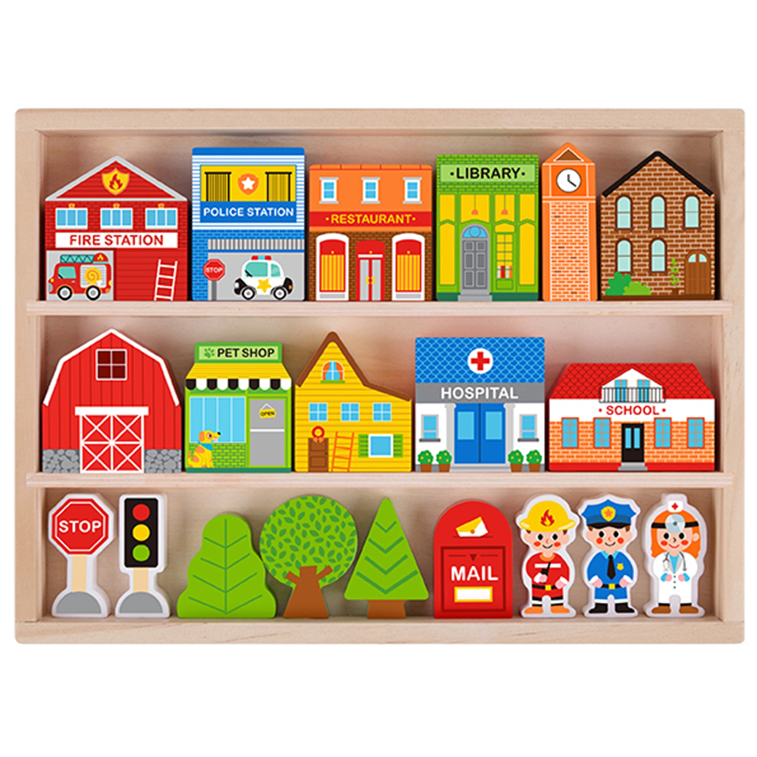 - Съдържание на комплекта: 11 сгради (напр. полиция, пожарна станция, болница, училище, библиотека, ресторант, зоомагазин, плевня, часовникова кула и 2 къщички)