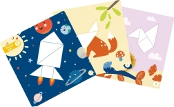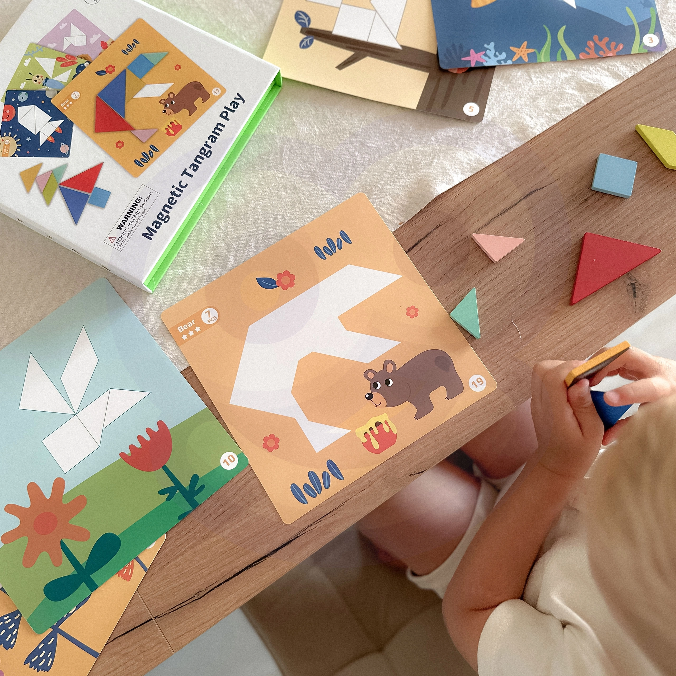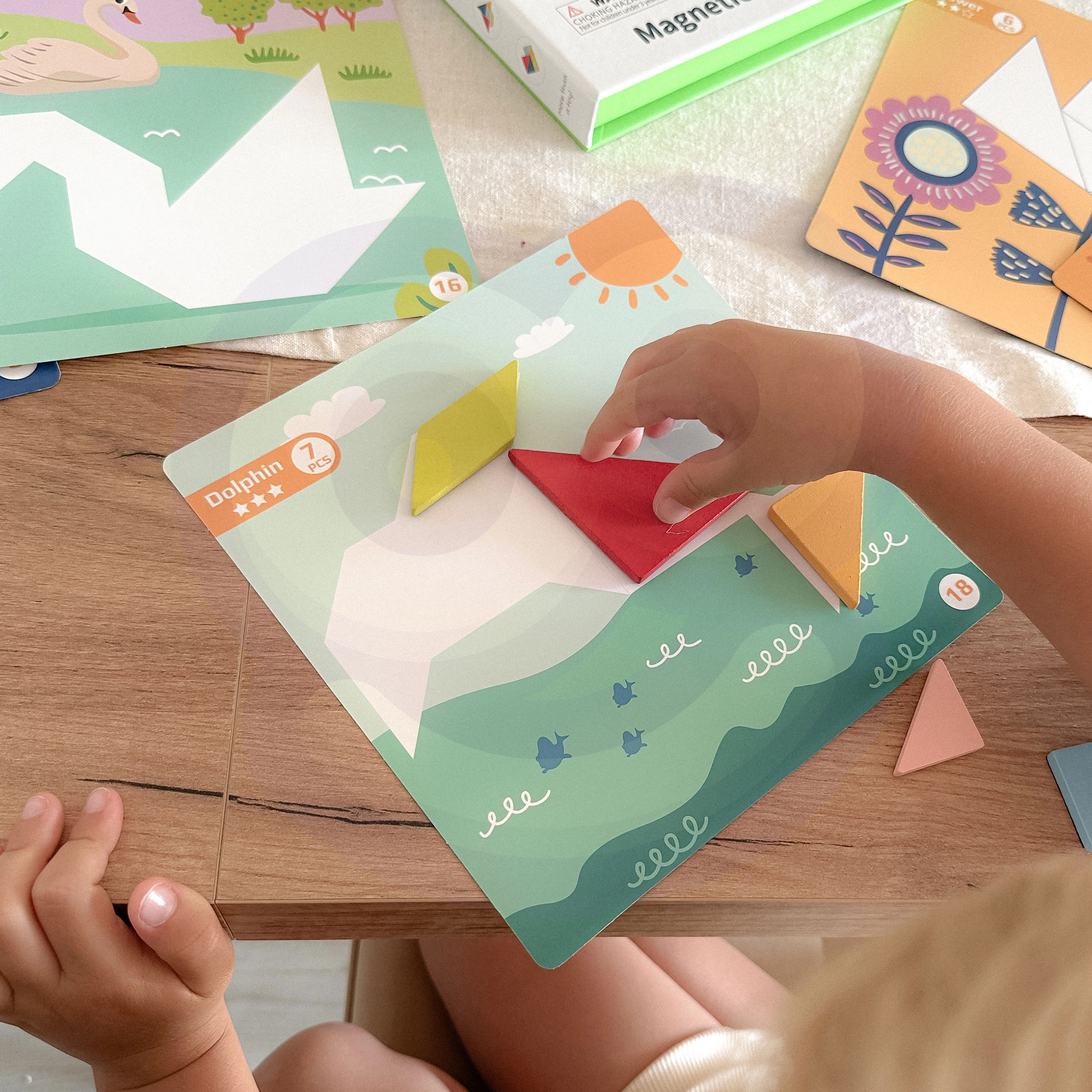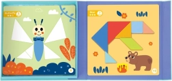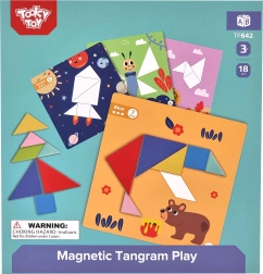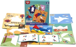 С магнитния танграм TOOKY TOY децата лесно подреждат форми и картинки върху подготвени шаблони. Цветните геометрични елементи прилепват към подложката, което прави играта удобна у дома и по време на път. Играта подкрепя въображението, концентрацията и самостоятелното решаване на задачи.