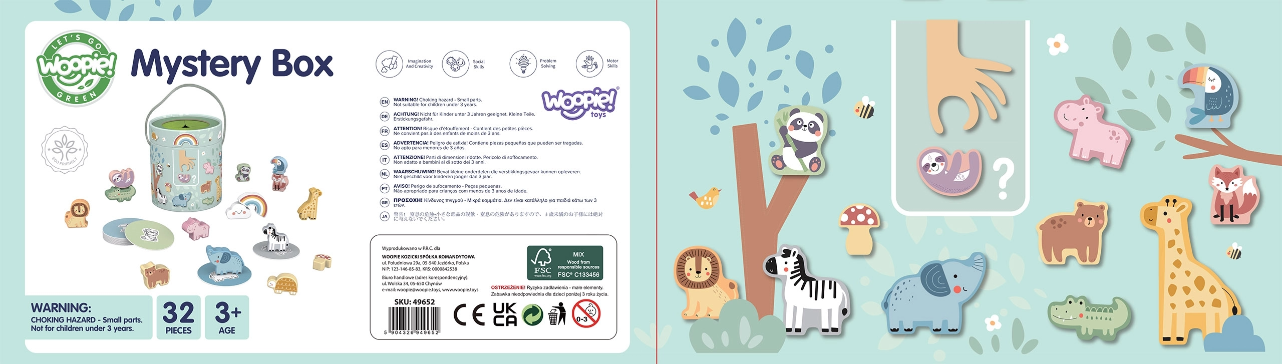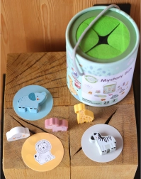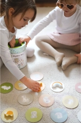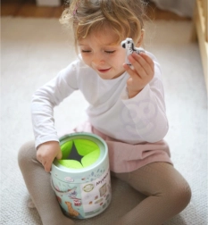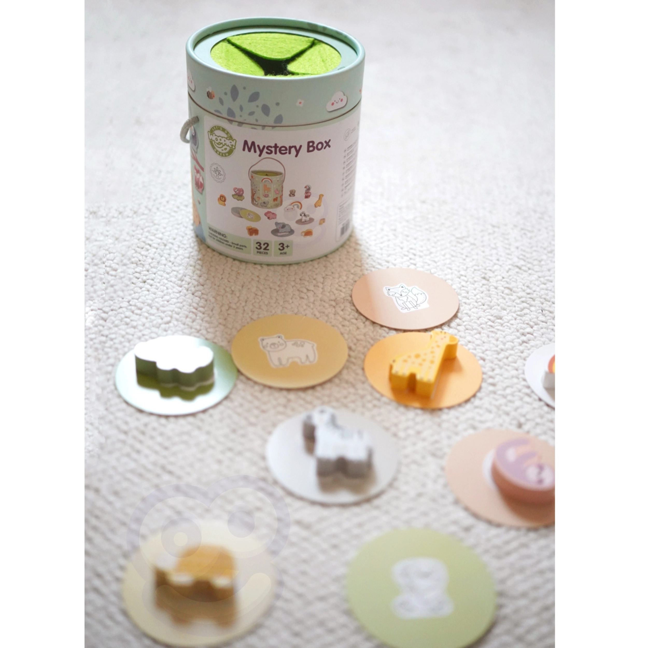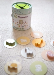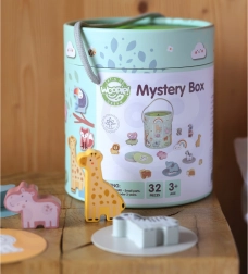 По време на играта Тайнствената Кутия децата избират една от 15 карти и чрез допир отгатват коя фигурка се крие в кутията – като същевременно се учат да разпознават нейната форма. Играта развива усещането за допир, фината моторика и концентрацията. Комплектът предлага различни креативни начини за игра, като съчетаване, учене на цветове, названия на животни и строене на кули.