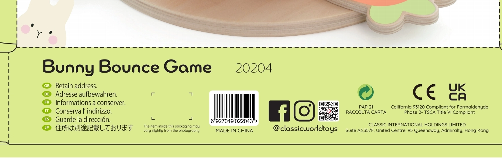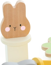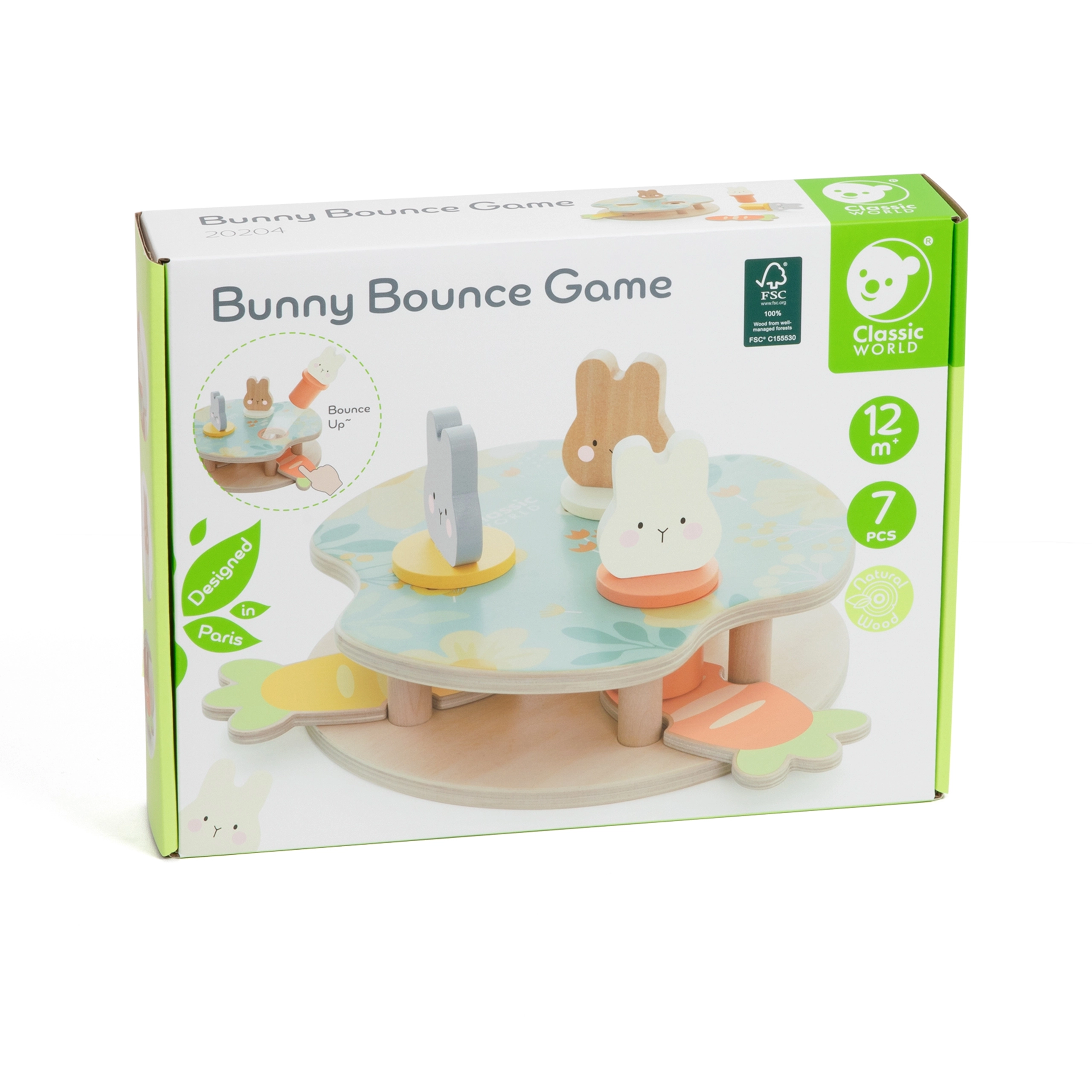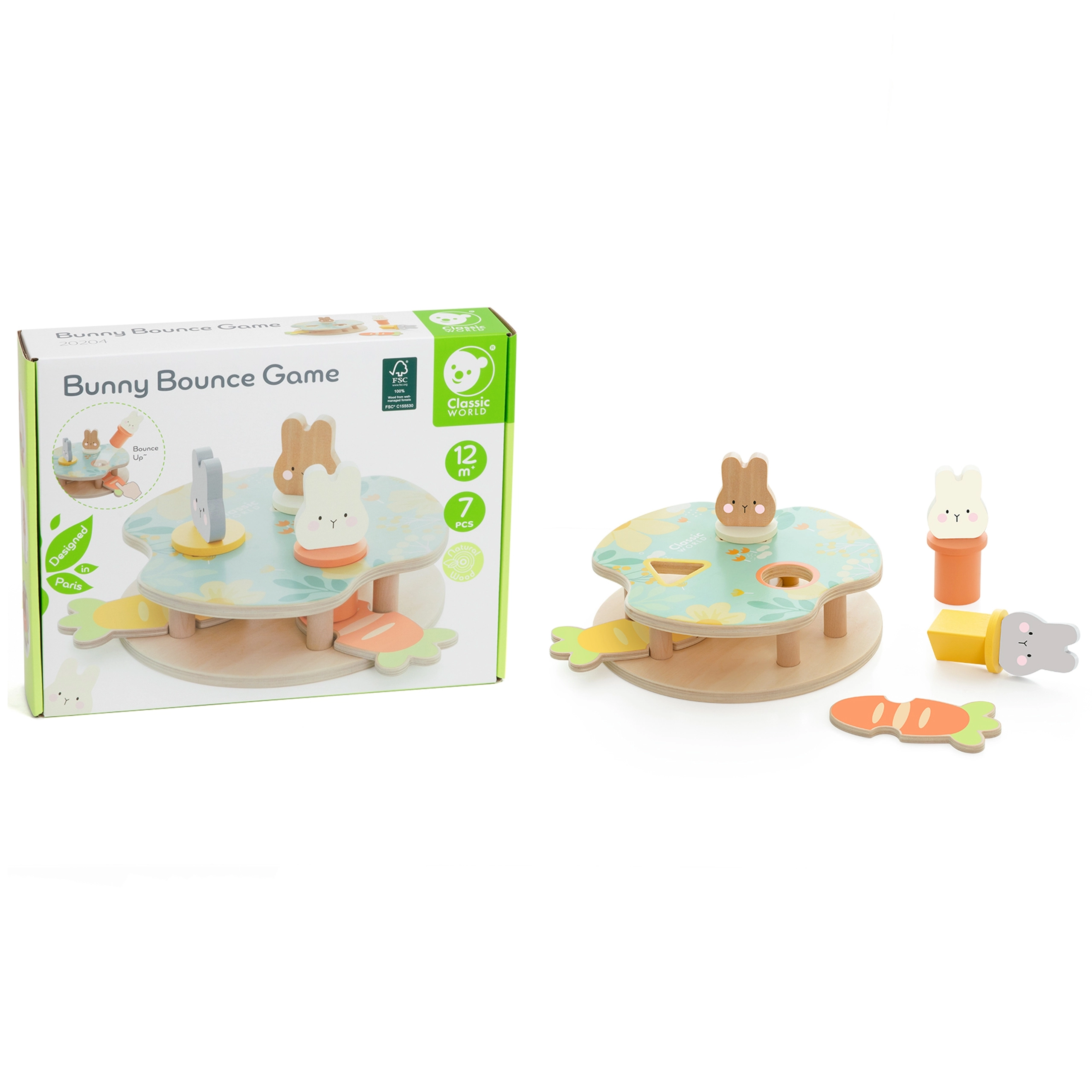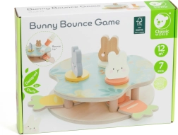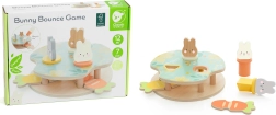 Играта Подскачащи Зайчета е чудесна за развитие на детските умения за разпознаване на цветове и форми. Вашата задача е да поставите трите сладки зайчета в съответните отвори и да ги съчетаете по цвят и форма. Когато натиснете морковите, зайчетата подскачат! Играчката е изработена от висококачествено дърво и няма остри ръбове, така че е безопасна за деца.