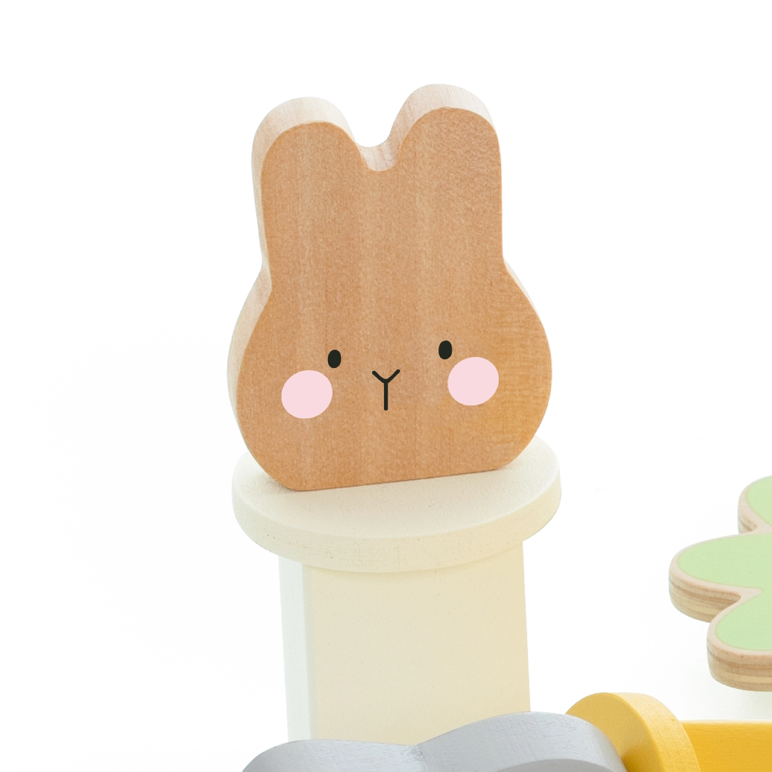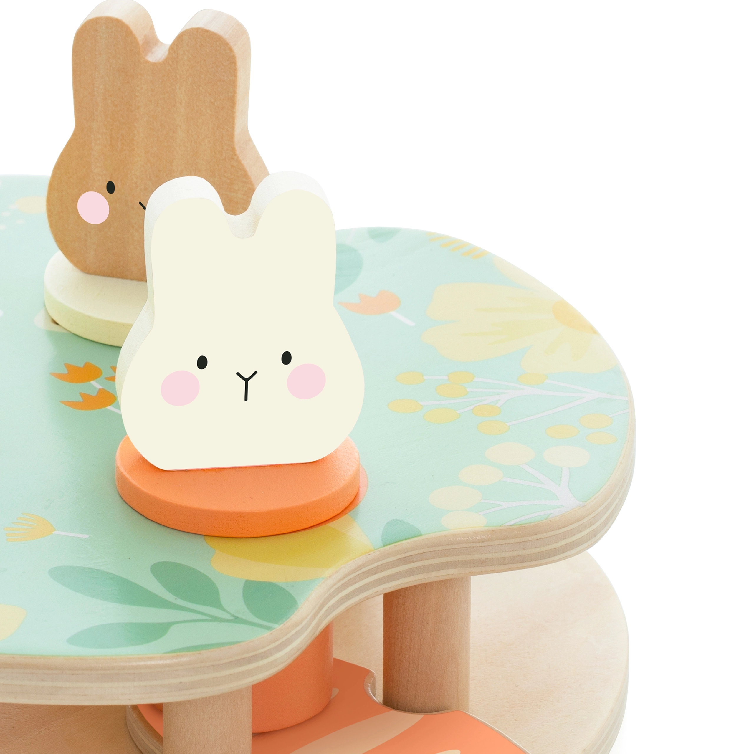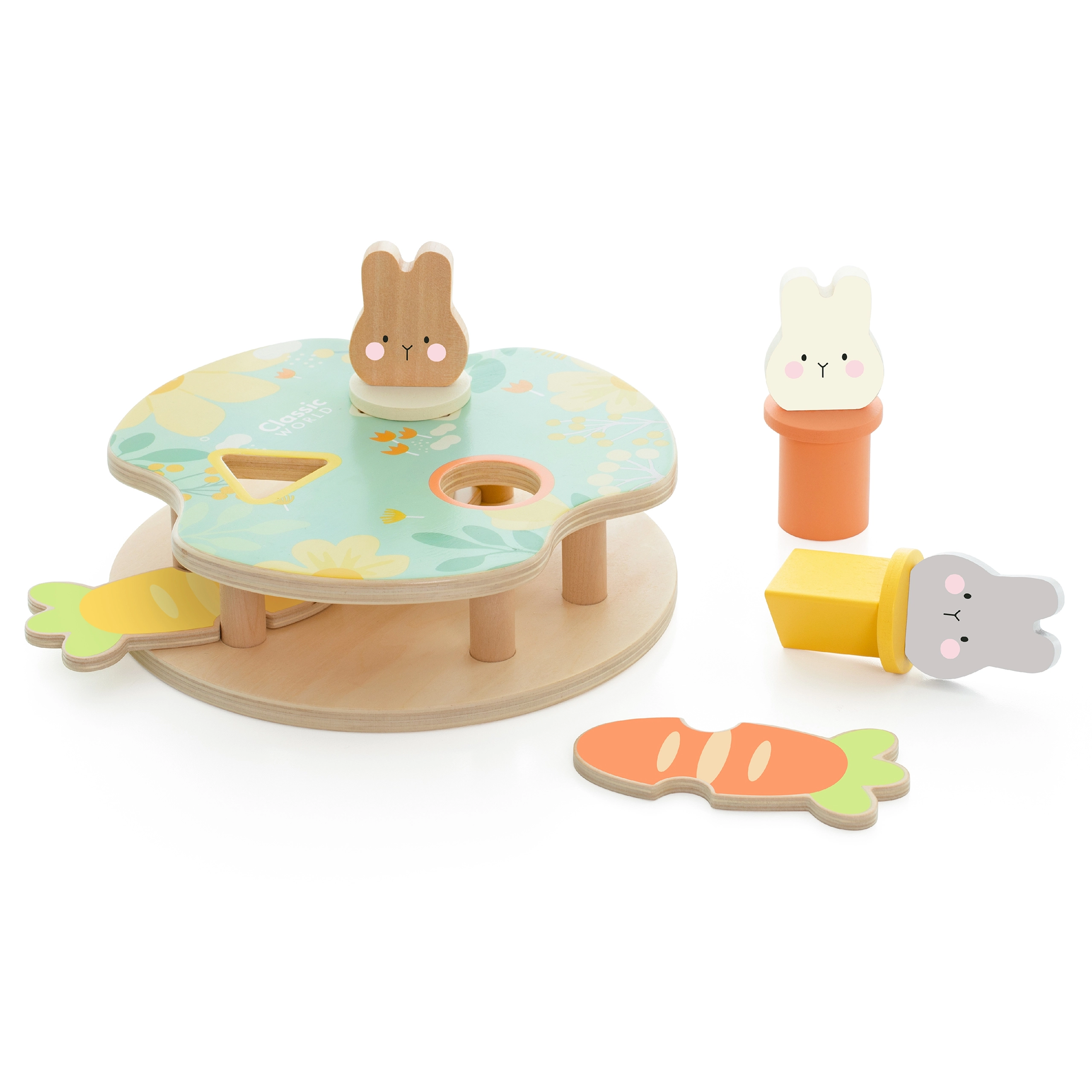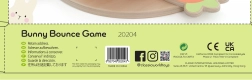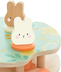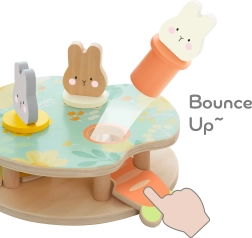 Играчката съдържа три цветни зайчета, които детето поставя в платформите според форма и цвят. Натискането на моркова кара зайчетата да подскочат!