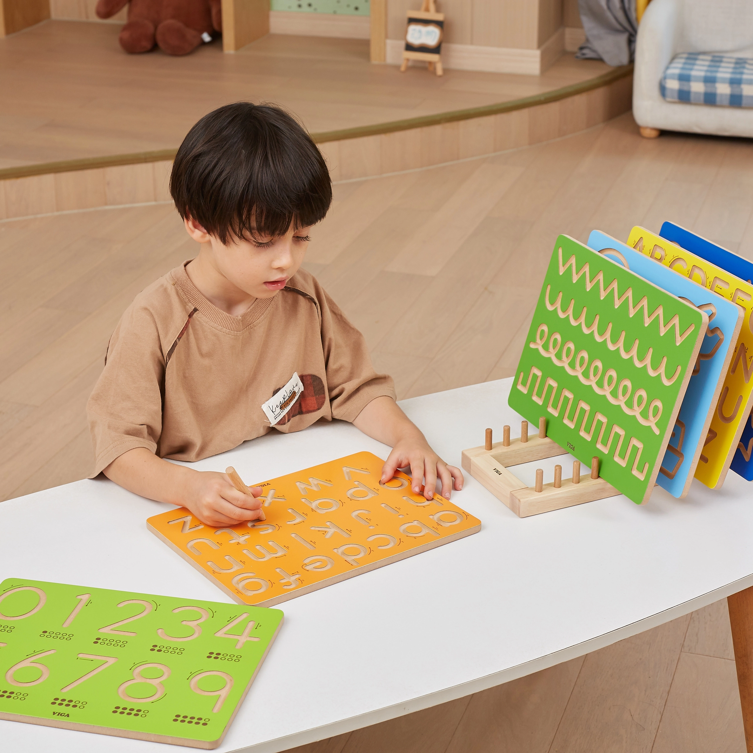 Дървената графомоторна табличка от марката VIGA помага на децата да тренират фината моторика и да подготвят ръката за писане. Благодарение на деликатно гравираните извити улеи децата лесно следват движенията, подобряват координацията око–ръка и изграждат мускулна памет. Компактният размер е идеален за маса и чин, а приятната дървена изработка насърчава многократно упражняване.