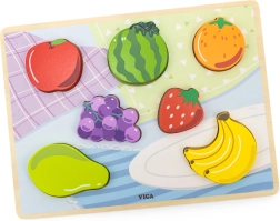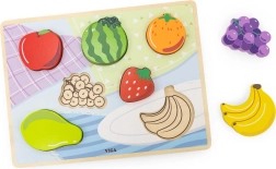 Открийте игривото учене с дървения пъзел с плодове от Viga. Комплектът включва здрава, цветно илюстрирана подложка и 7 елемента (ябълка, пъпеш/диня, портокал, грозде, ягода, банани и круша), които децата поставят в съответните форми. Ярките цветове и ясните контури подпомагат разпознаването на форми и цветове.