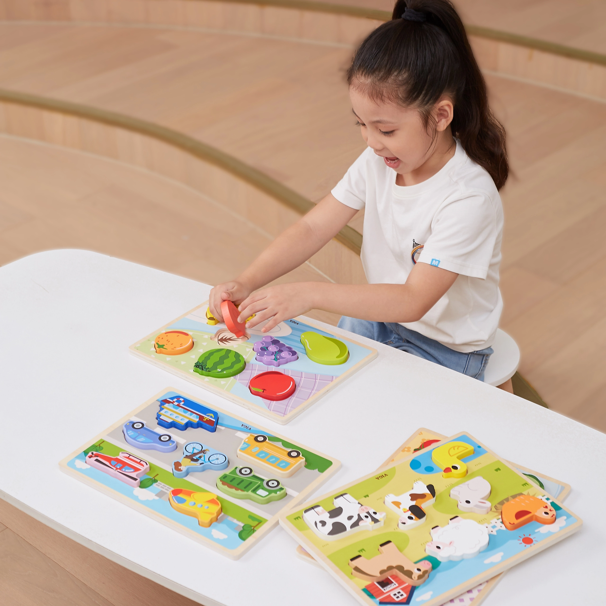 Благодарение на качественото дърво и гладката обработка частите са приятни на допир и безопасни за малки деца. Пъзелът е подходящ от 18 месеца и отлично развива концентрацията, търпението и паметта. Частите могат да се използват и извън подложката като фигурки за креативна игра.
