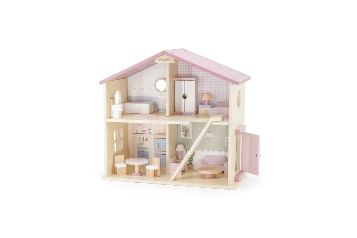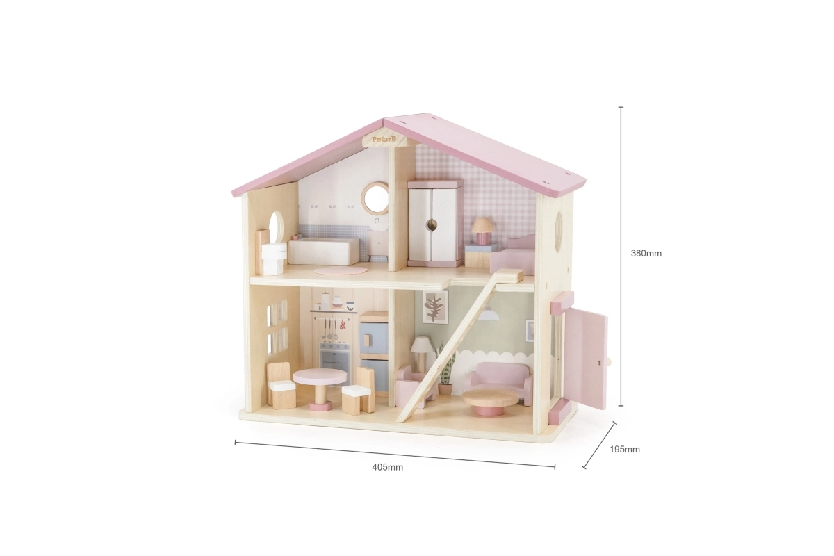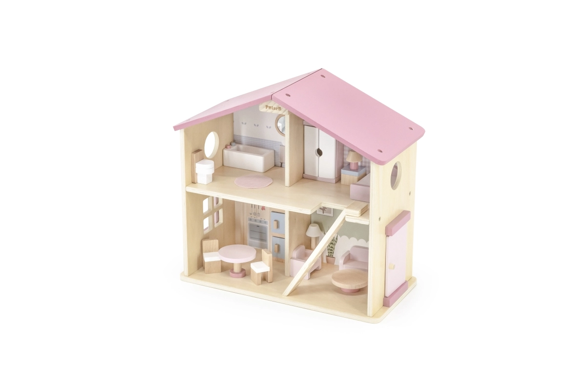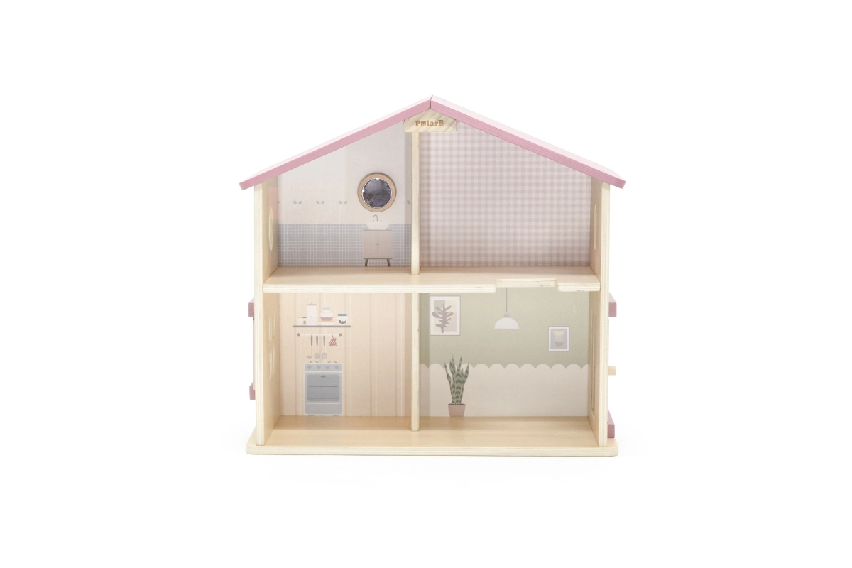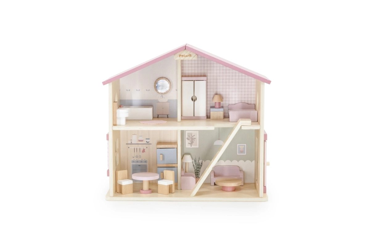 Дървената къща за кукли Viga PolarB предоставя на децата красиво пространство за креативна игра. Двата етажа със стълбище предлагат кухня, дневна, баня и уютна спалня – всяка стая е внимателно проектирана и оборудвана с детайлни аксесоари. Благодарение на здравата изработка от качествено дърво и вечните пастелни цветове къщата е устойчива, безопасна и чудесно се вписва в детската стая.