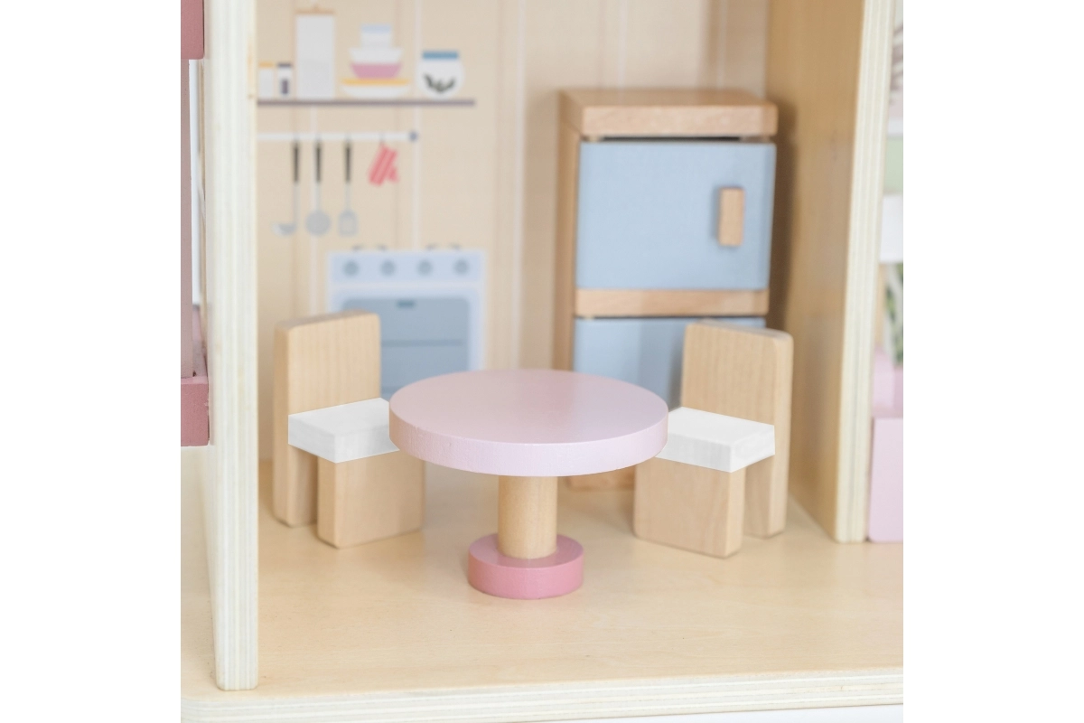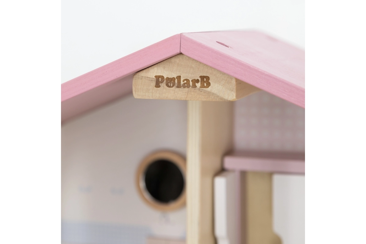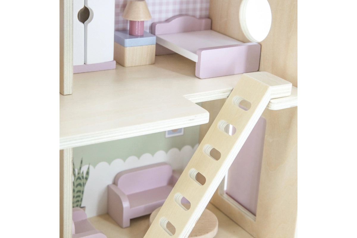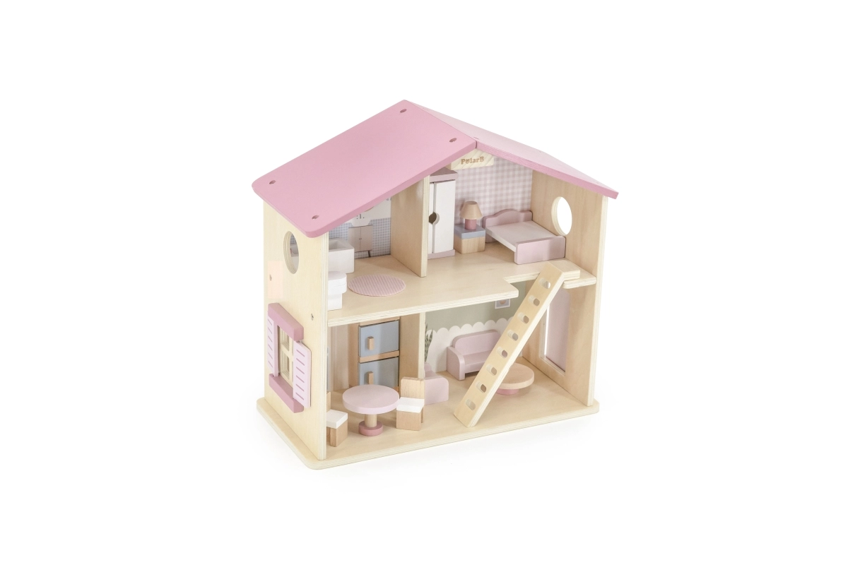 Дървената къща за кукли Viga PolarB предоставя на децата красиво пространство за креативна игра. Двата етажа със стълбище предлагат кухня, дневна, баня и уютна спалня – всяка стая е внимателно проектирана и оборудвана с детайлни аксесоари. Благодарение на здравата изработка от качествено дърво и вечните пастелни цветове къщата е устойчива, безопасна и чудесно се вписва в детската стая.