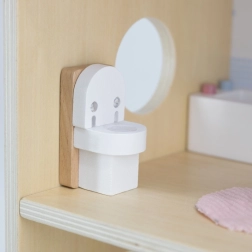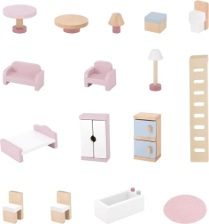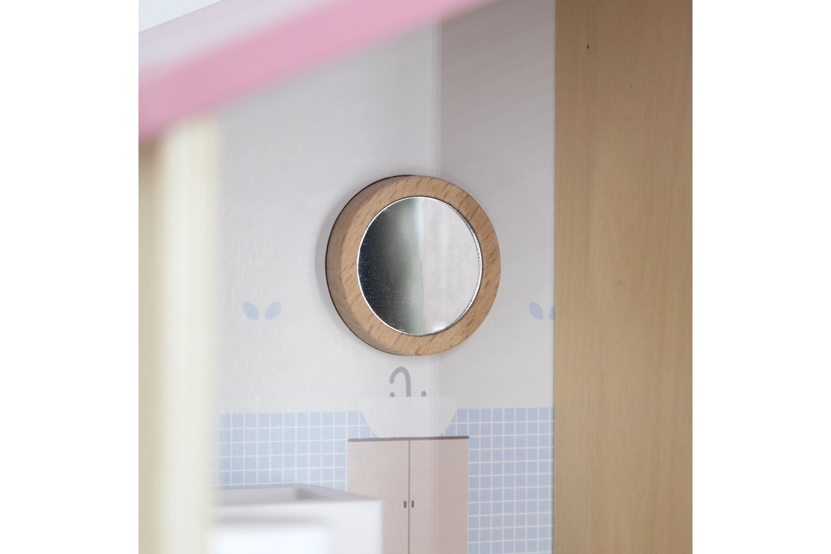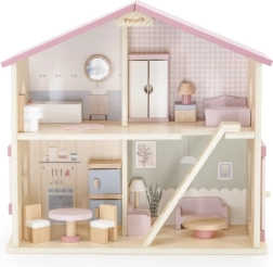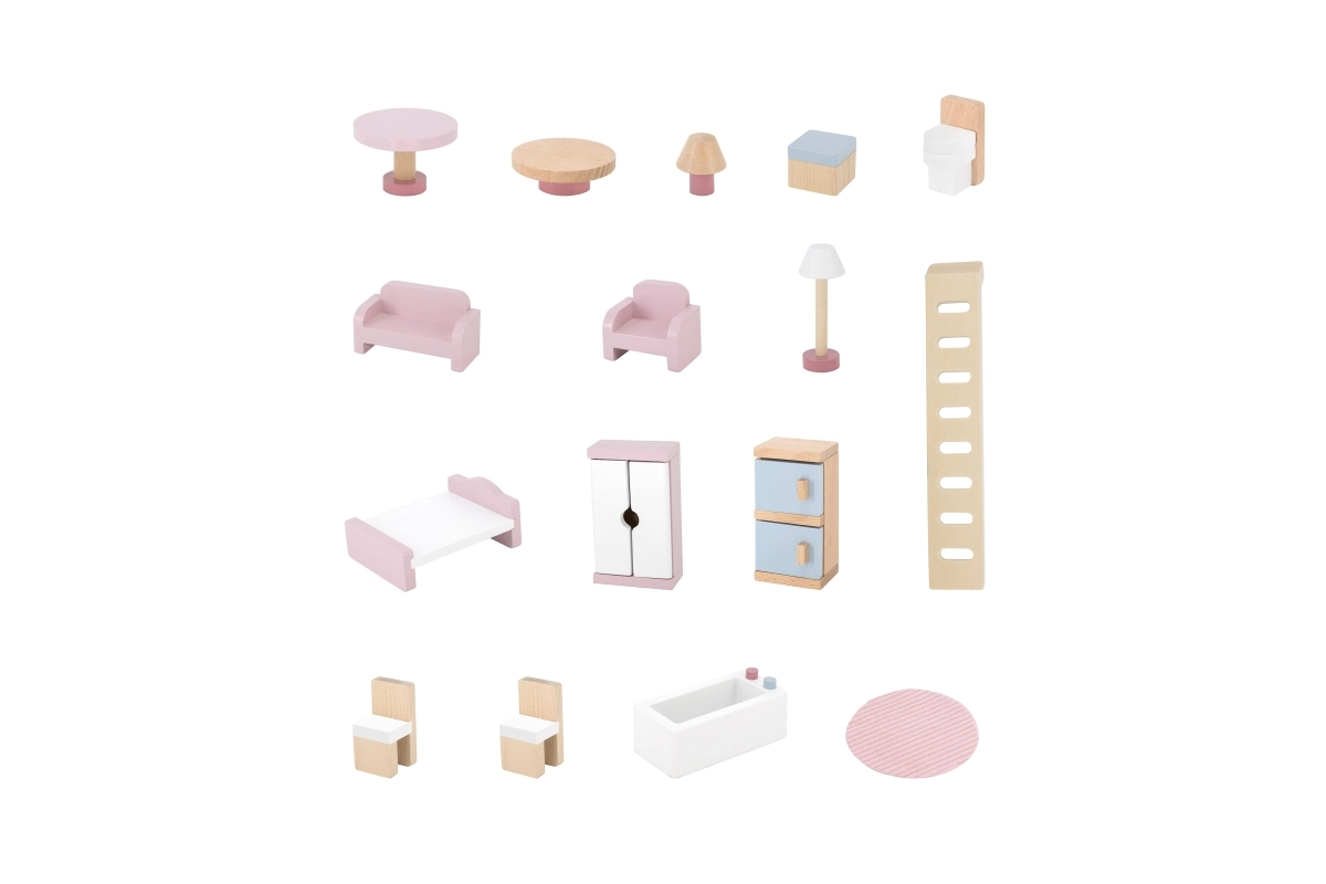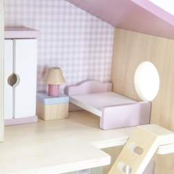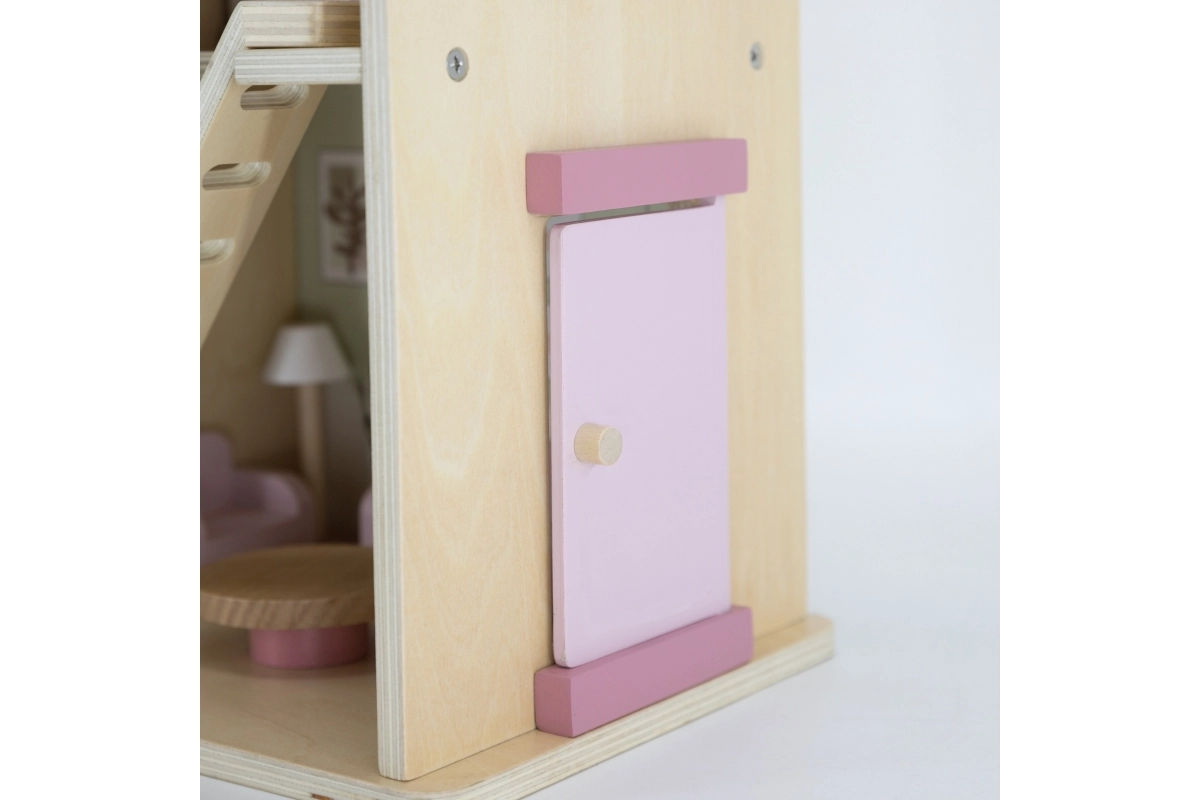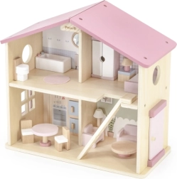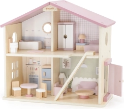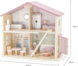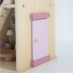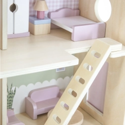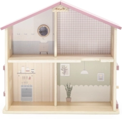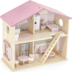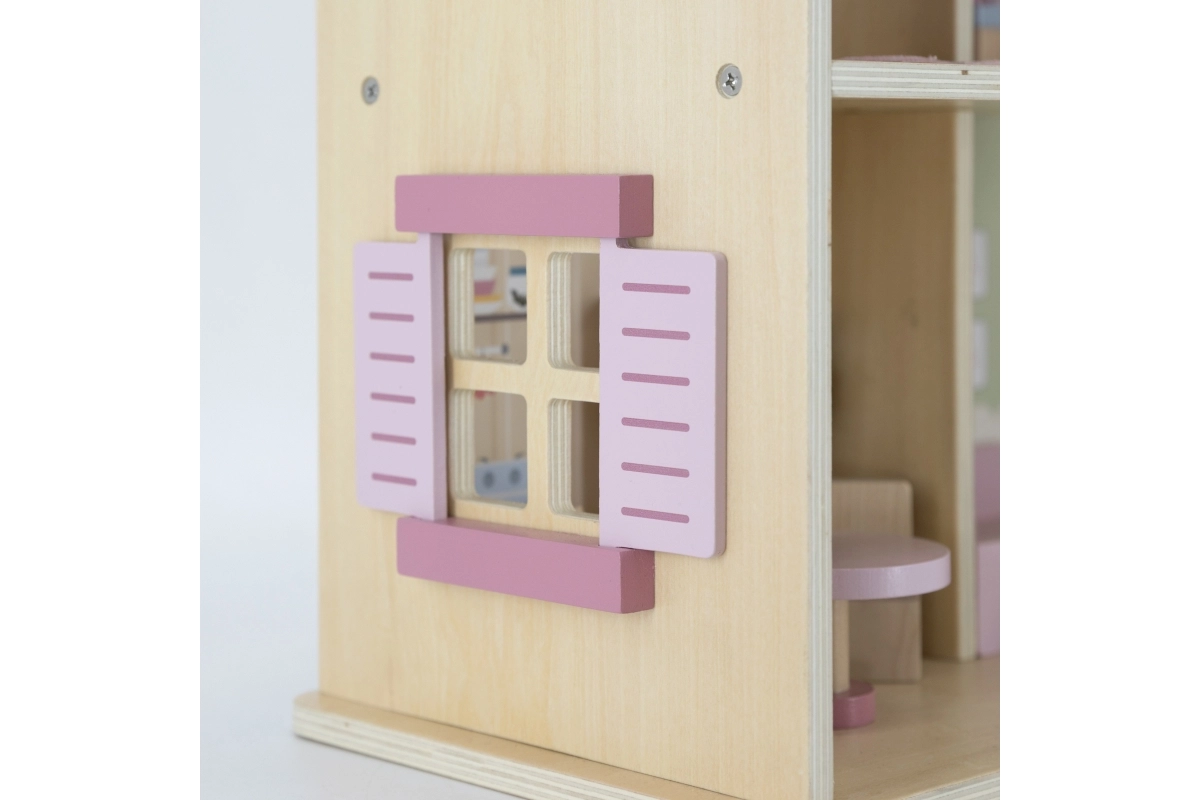 Дървената къща за кукли Viga PolarB предоставя на децата красиво пространство за креативна игра. Двата етажа със стълбище предлагат кухня, дневна, баня и уютна спалня – всяка стая е внимателно проектирана и оборудвана с детайлни аксесоари. Благодарение на здравата изработка от качествено дърво и вечните пастелни цветове къщата е устойчива, безопасна и чудесно се вписва в детската стая.