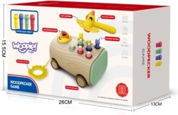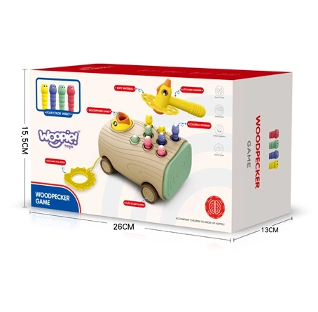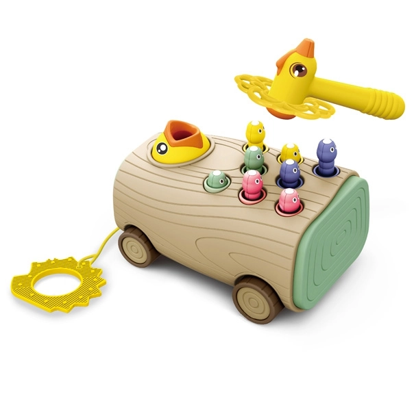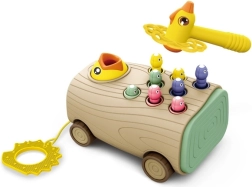 Тази интерактивна играчка расте заедно с детето: от първите му стъпки като дърпано возило с плавно движение, през почукване на червейчета с безопасно чукче, до магнитно ловене на скрити елементи с помощта на птичка с магнит. Стимулира концентрацията, търпението и развитието на сензорните възприятия.