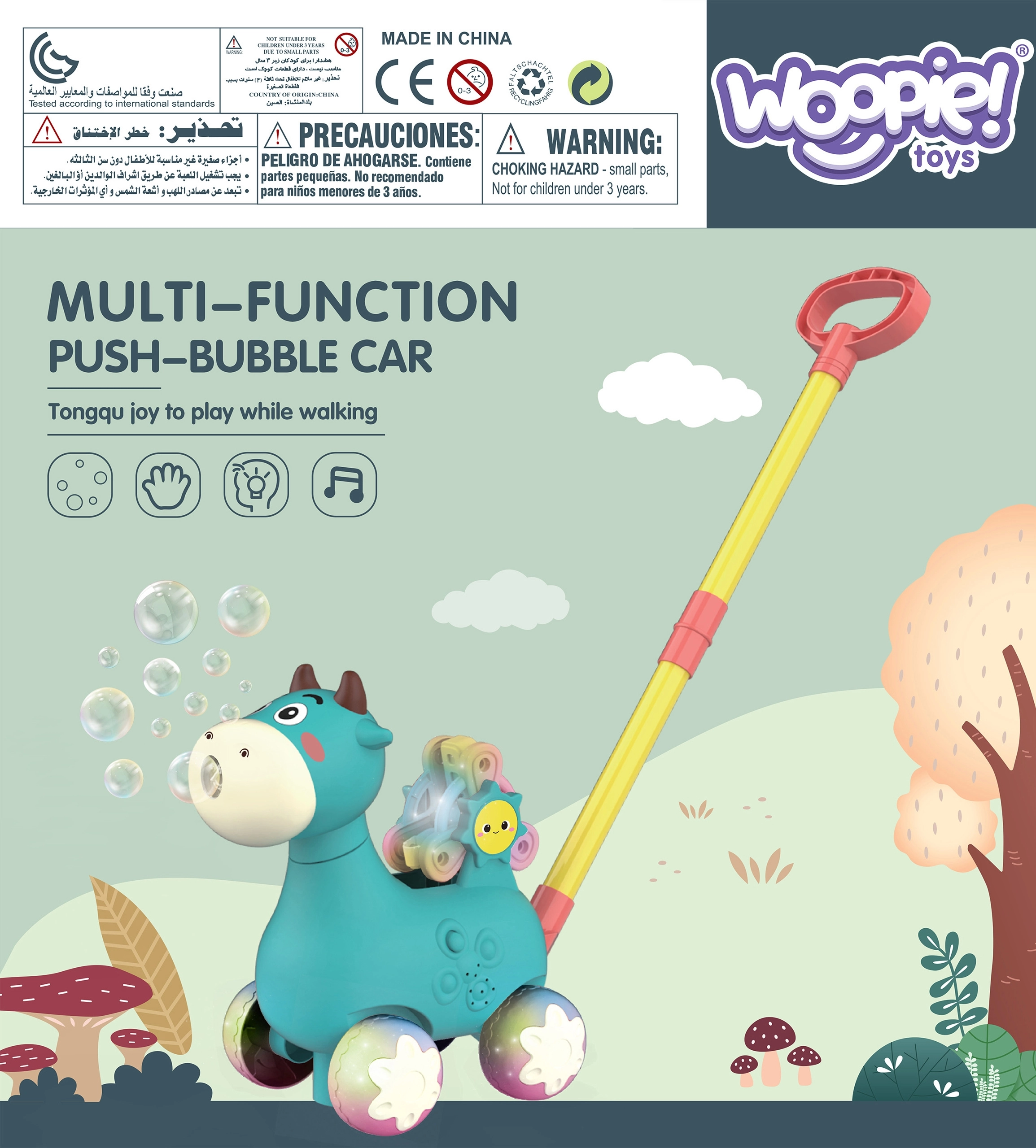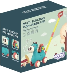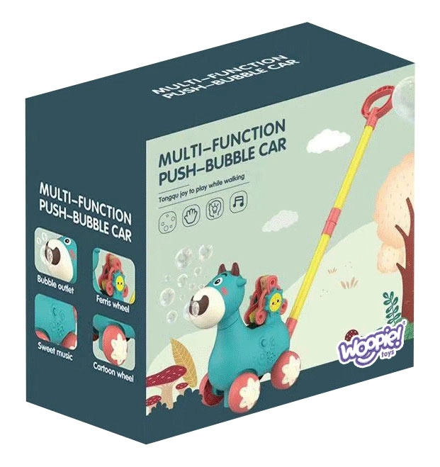 Очарователната проходилка кравичка WOOPIE помага на децата по-уверено да се изправят на крака и да се забавляват. При бутане пуска балончета от устичката, свири мелодии и има въртящ се въртележка с буквите A, B, C за първи стъпки в ученето. Благодарение на удобната дръжка и стабилната конструкция подпомага координацията и фината и едрата моторика на деца от 3 години.