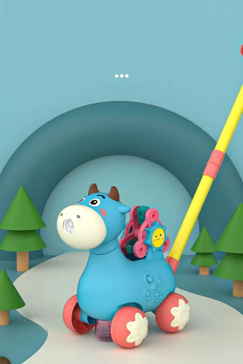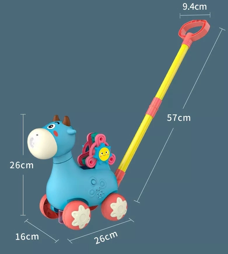 Игривата и функционална проходилка във форма на кравичка мотивира децата към активност и едновременно ги възнаграждава с весели мелодии и балончета. Достатъчно е да завиете контейнерчето с разтвора (2 бр. в комплекта) и по време на ходене от устичката на кравичката се освобождават нежни балони. Въртележката с буквите A, B, C насърчава първото запознаване с азбуката.