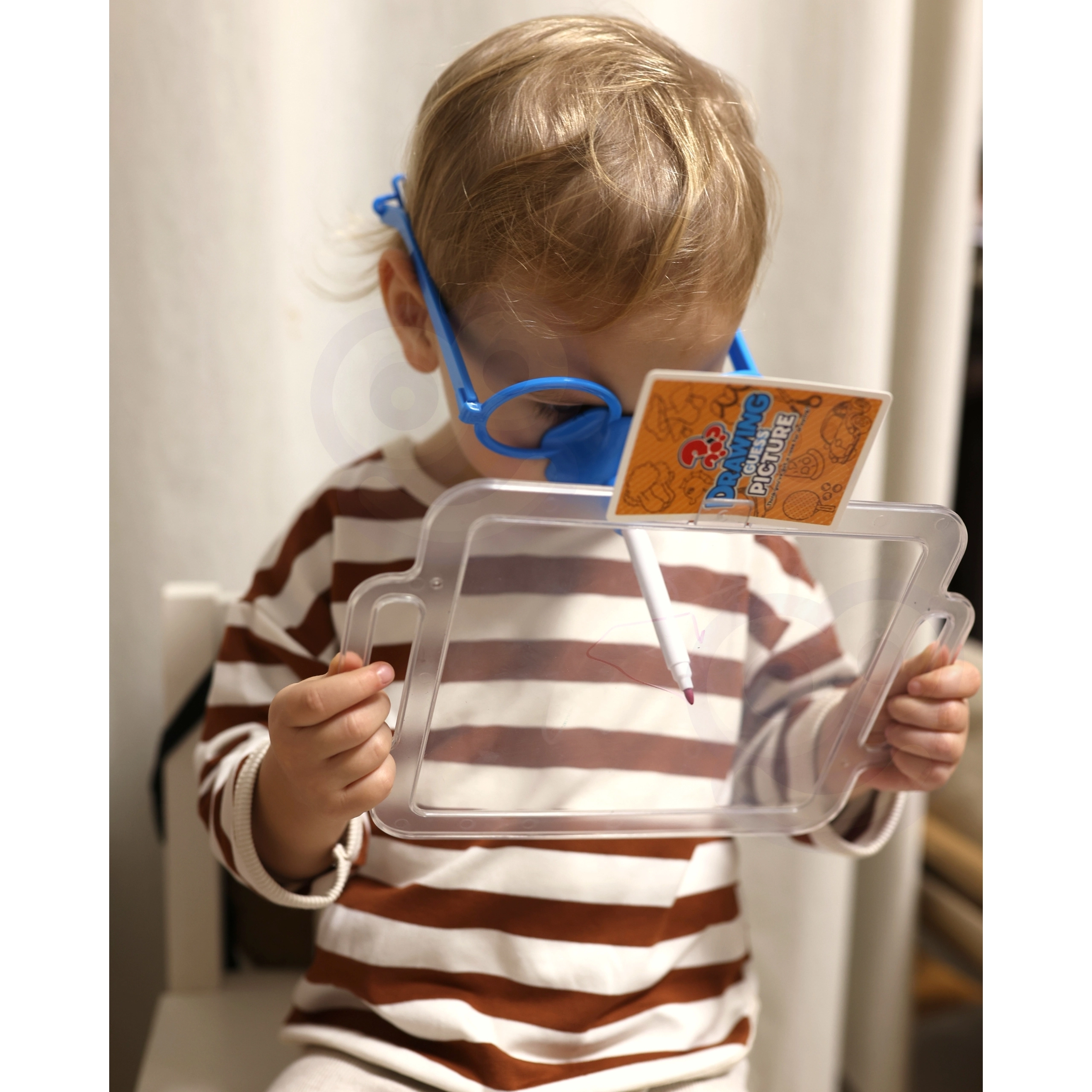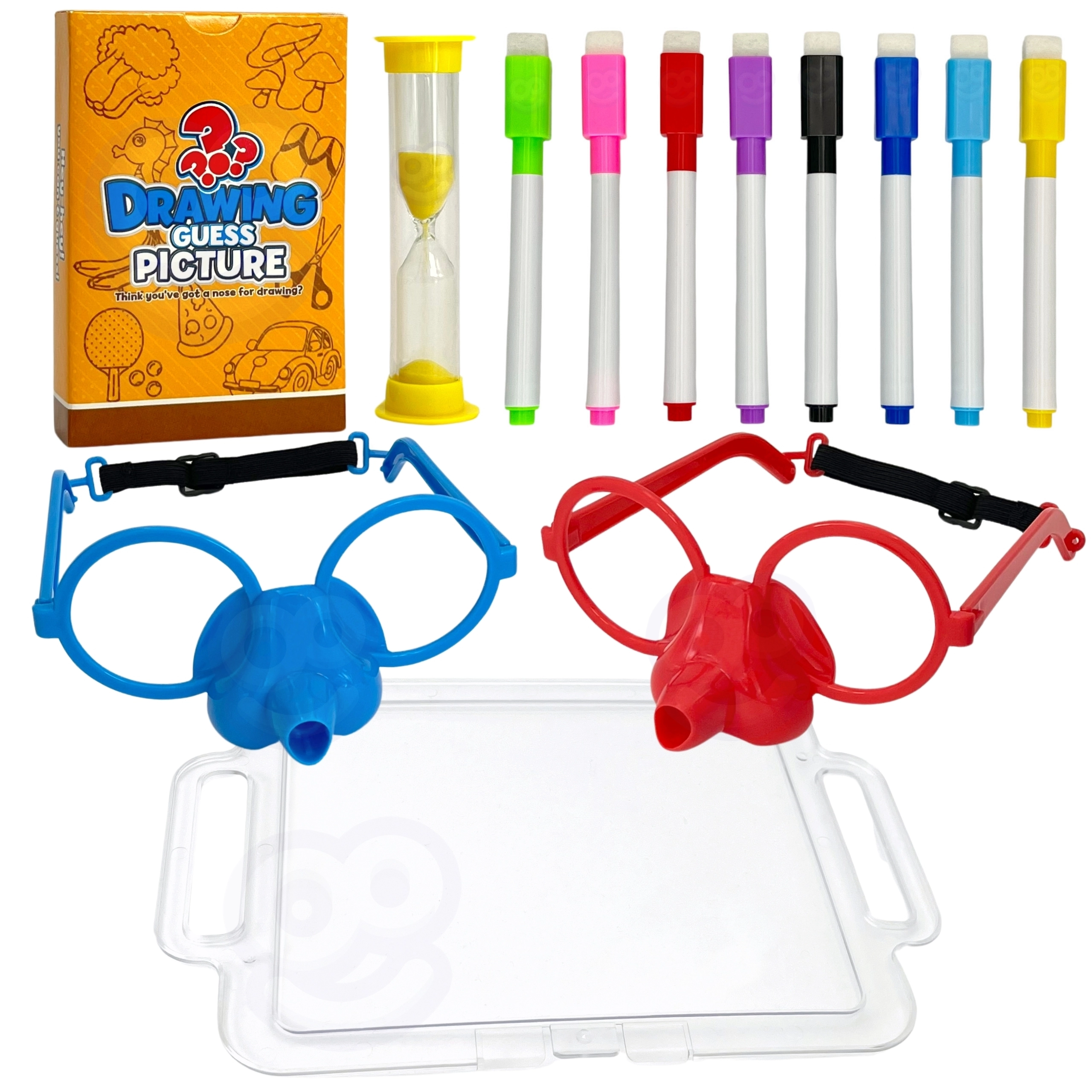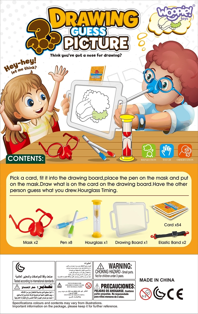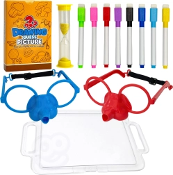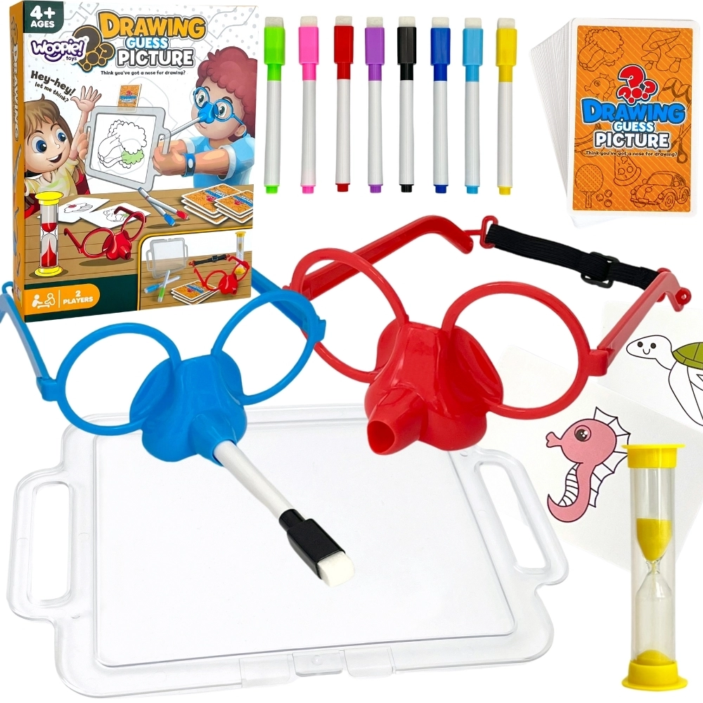 Представете си да рисувате само с носа! Със страхотната игра Нарисувай и познай картинката от марката Woopie това е възможно. Сложете специалните очила с маркер и нарисувайте на таблото произволно изтеглената картинка, за да помогнете на вашия отбор да отгатне думите. Времето тече, побързайте – пясъчният часовник вече тиктака!