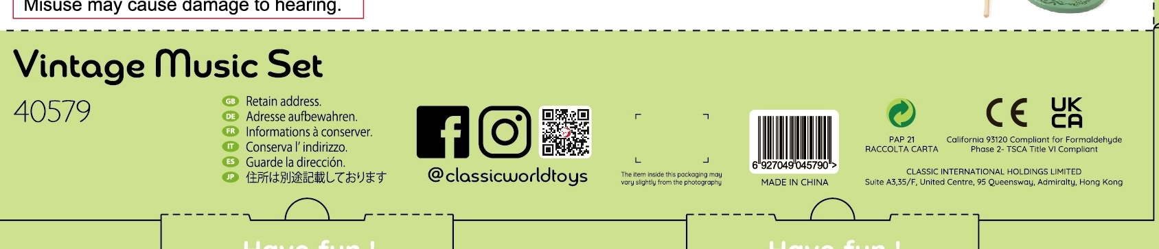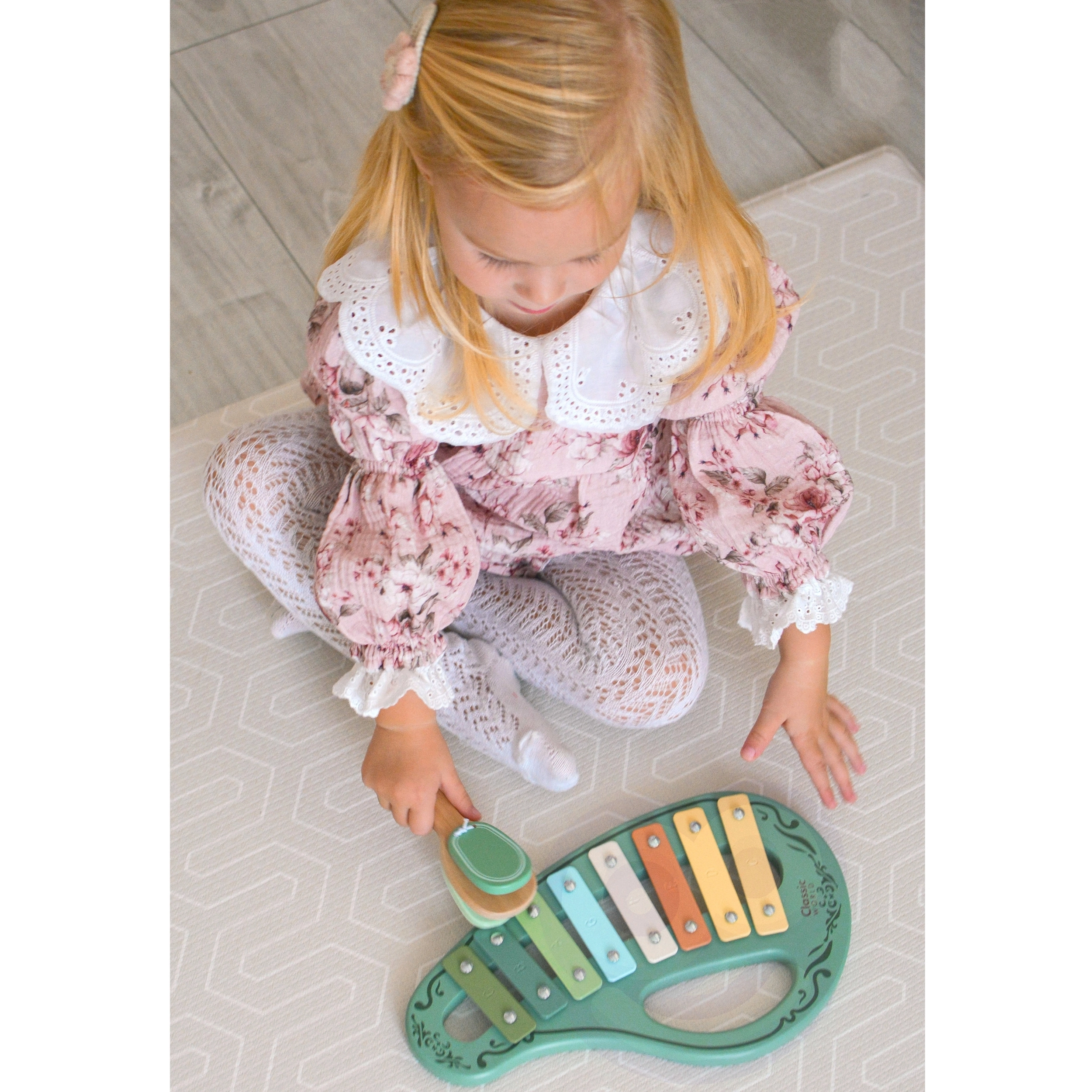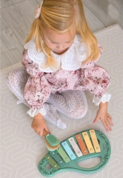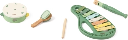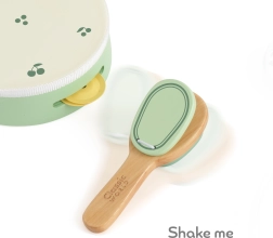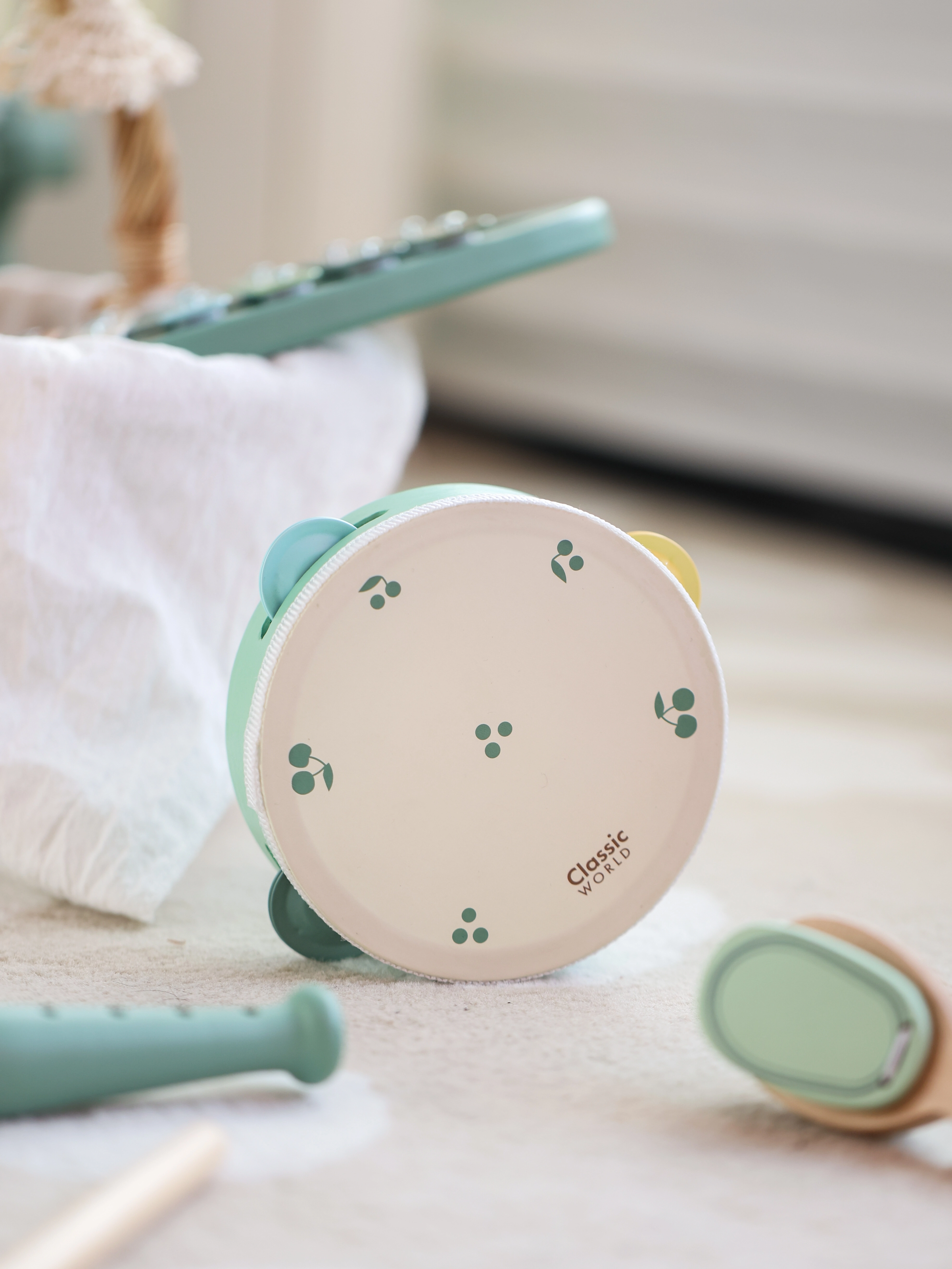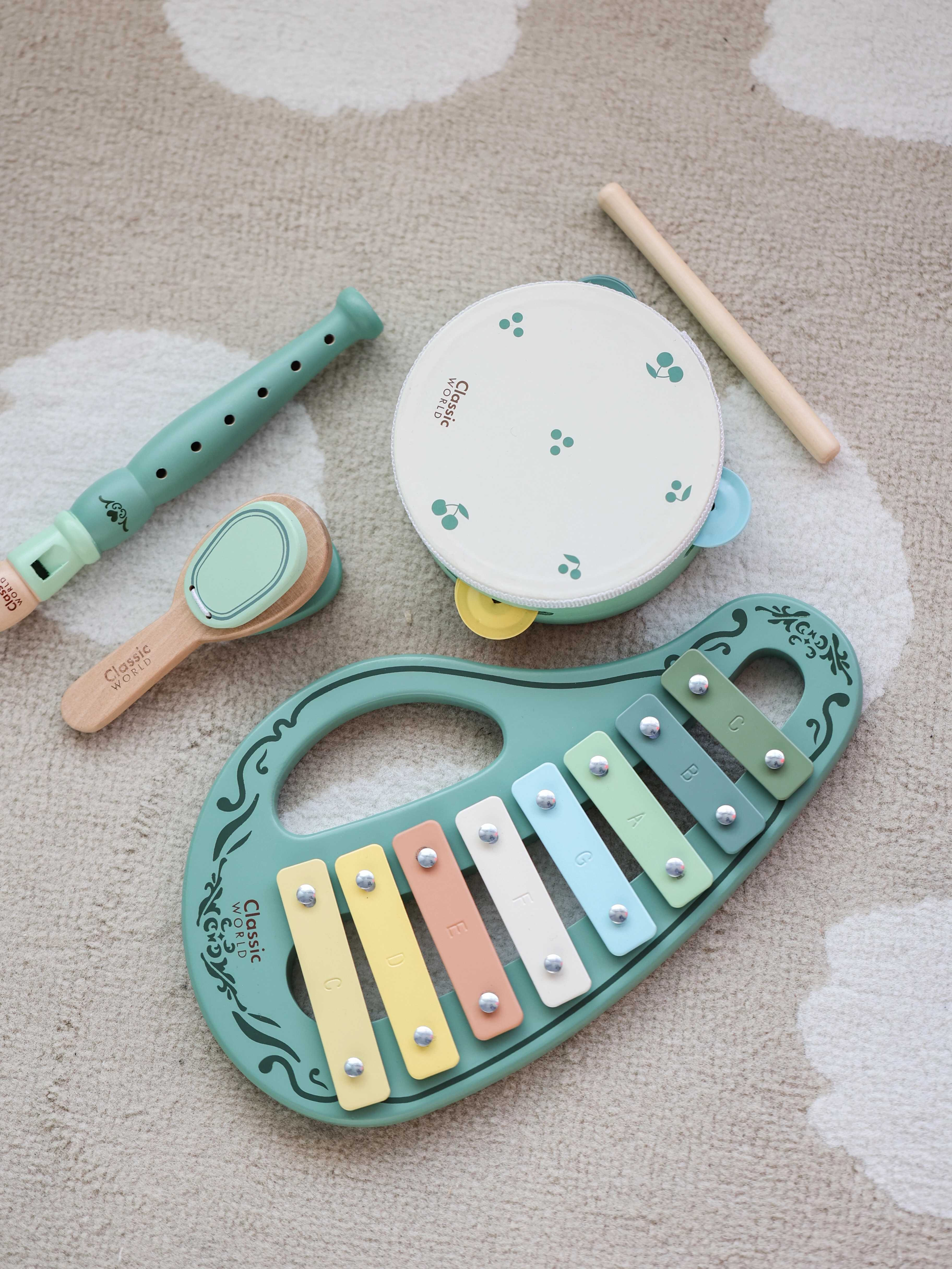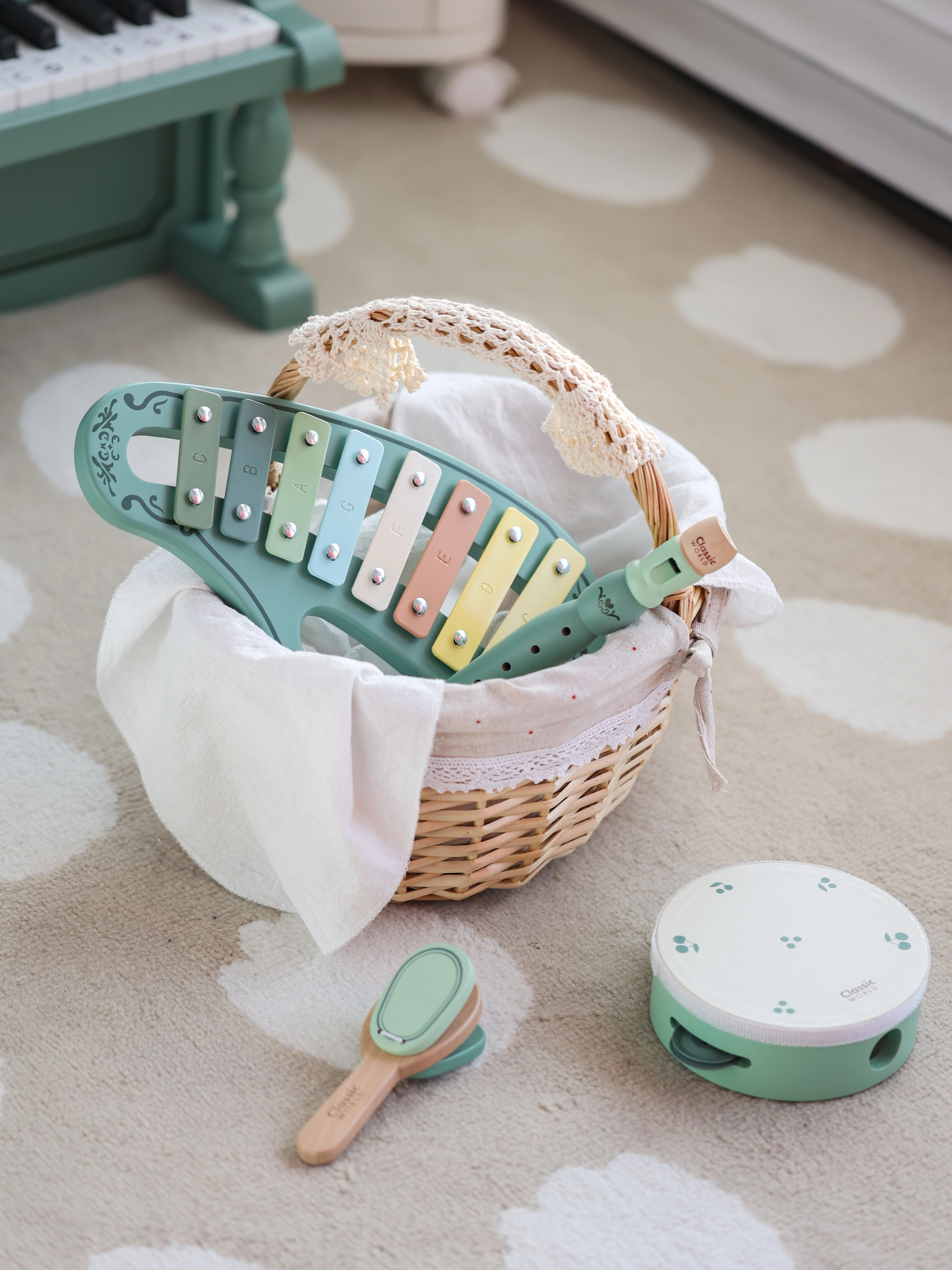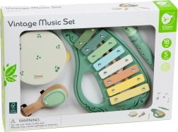 Този стилен комплект във винтидж изпълнение съдържа всичко, от което малките деца се нуждаят, за да откриват света на звуците: чинели (ксилофон), дайре, флейта/рекордер, кастанета и палка. Благодарение на комбинацията от дърво и метал инструментите имат приятен звук и издържат на ежедневна игра.
