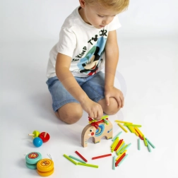 Открийте многофункционалния дървен комплект игри от марката TOOKY TOY, който ще донесе на децата часове творческо забавление. Очарователният слон служи като основа за строене, цветните клечки се използват за микáдо, а в комплекта има и две йо-йо играчки и пумпал. Играта подпомага фината моторика, координационните умения и търпението, изработена е от безопасни и нетоксични материали и чудесно развива логическото мислене.