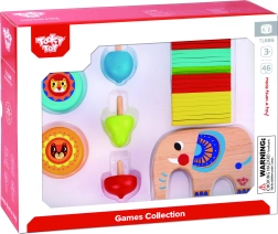 Този пъстър 46-частов дървен комплект комбинира няколко любими игри в едно. Децата могат да балансират клечки върху гърба на слона, да строят кула или кладенец, да играят микáдо, да тренират трикове с двете йо-йо играчки и да премерят чий пумпал ще се върти по-дълго. Идеален за самостоятелна игра и семейни състезания.
