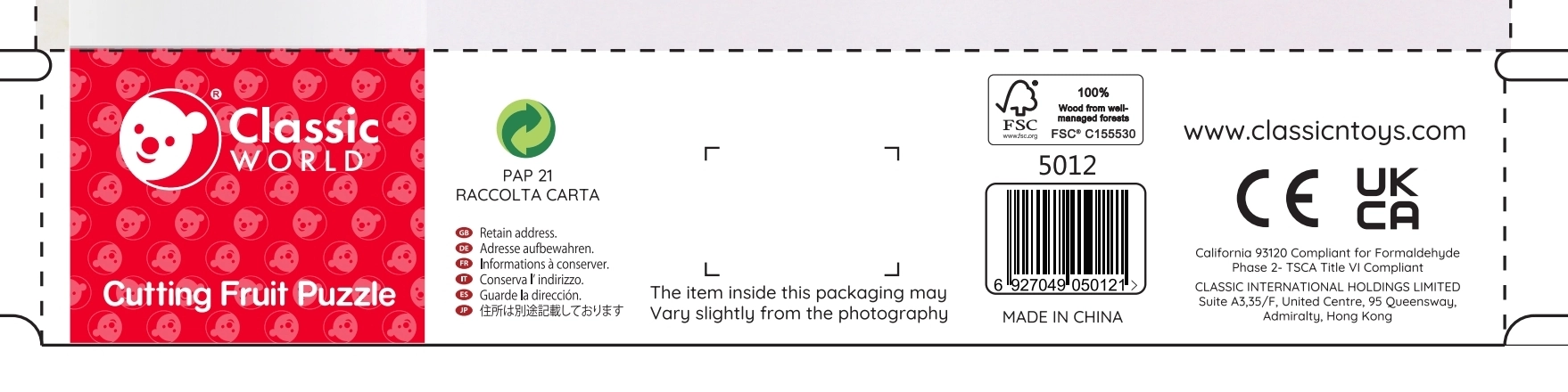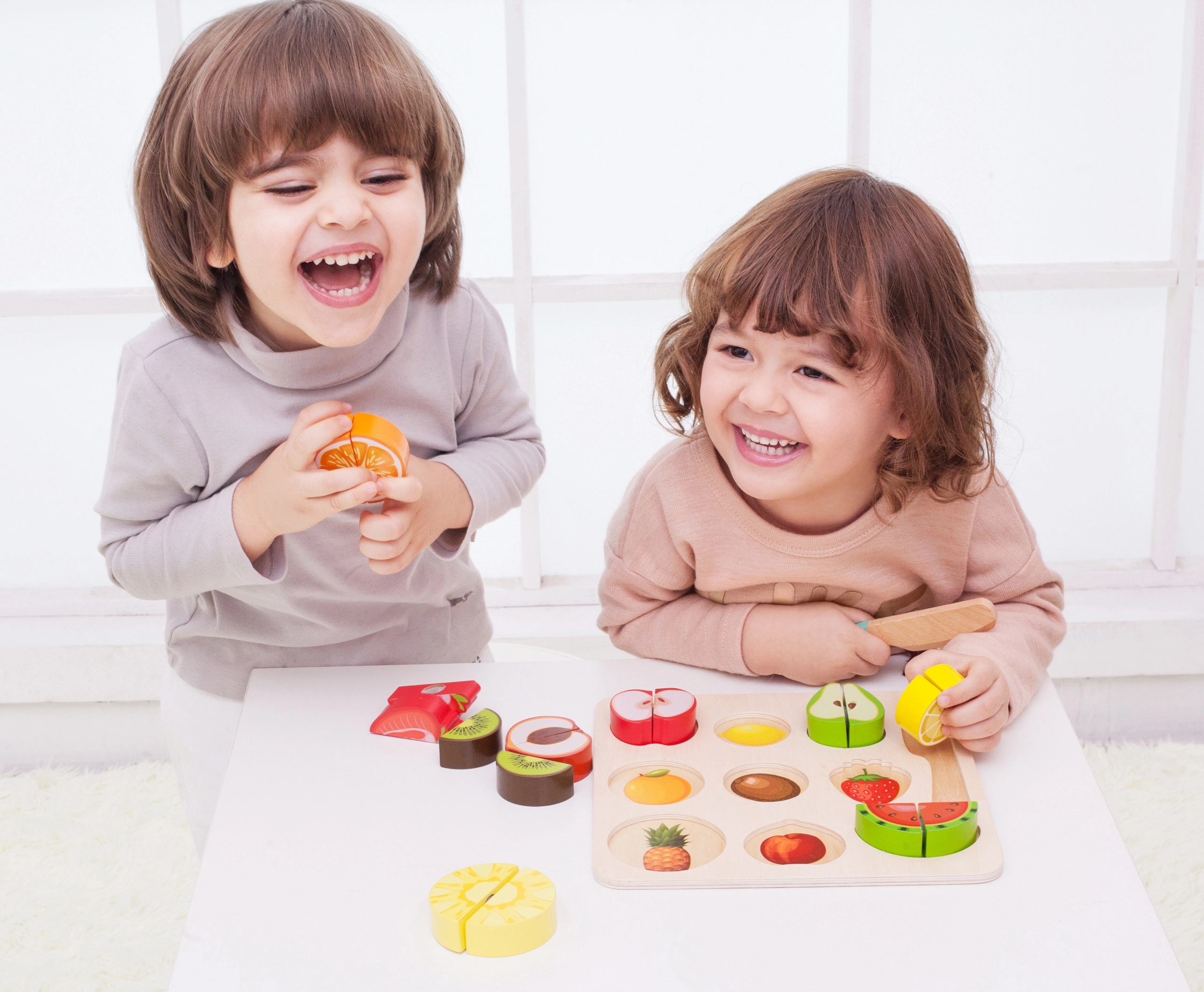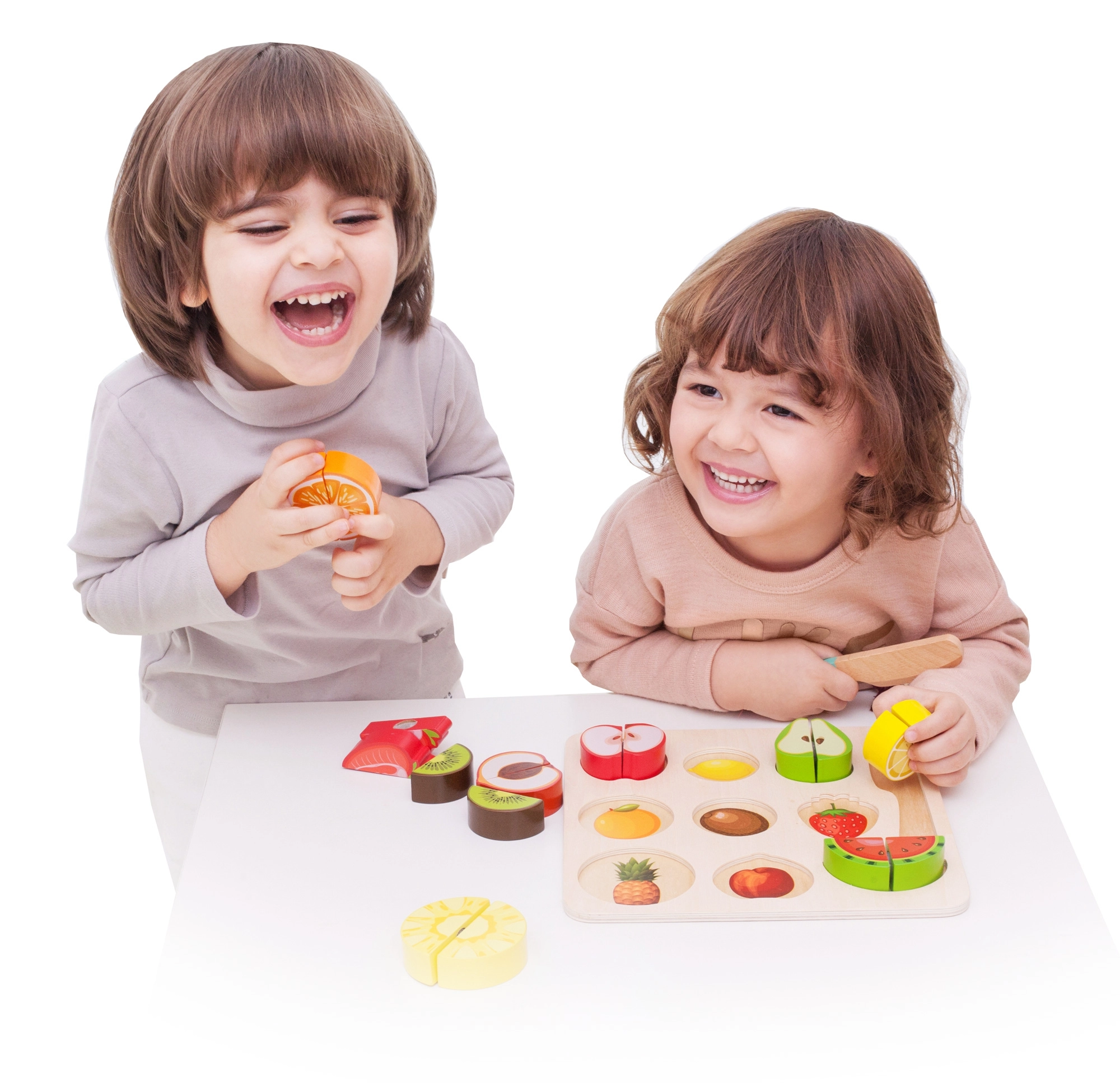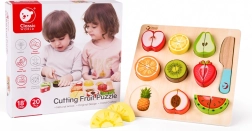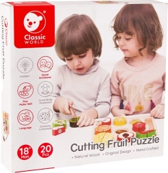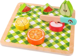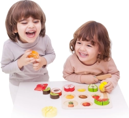 Комплектът съдържа 20 части, включително двустранна дъска, ножче и различни плодове. Тази безопасна играчка за деца от 18 месеца е изработена от лакирано дърво и боядисана с нетоксични бои, което гарантира, че е напълно безопасна за използване.