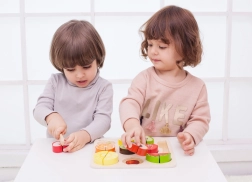 Децата подобряват фината моторика при подреждане и рязане на плодовете с дървения нож.