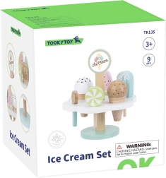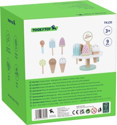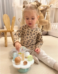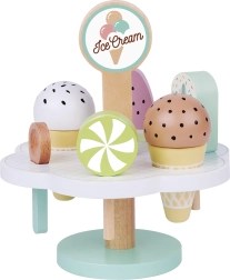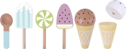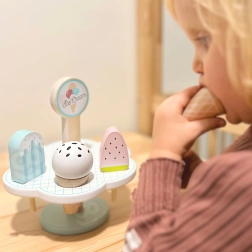 Този прекрасен дървен сет сладоледи е идеален за деца, които обичат креативната игра. Пастелните цветове и прецизната изработка осигуряват часове забавление при игра на продавач на сладолед или при обзавеждане на детската кухня. Здравословен избор за развитие на детската креативност и социални умения. Магнитите осигуряват стабилност, което прави играта още по-приятна.
