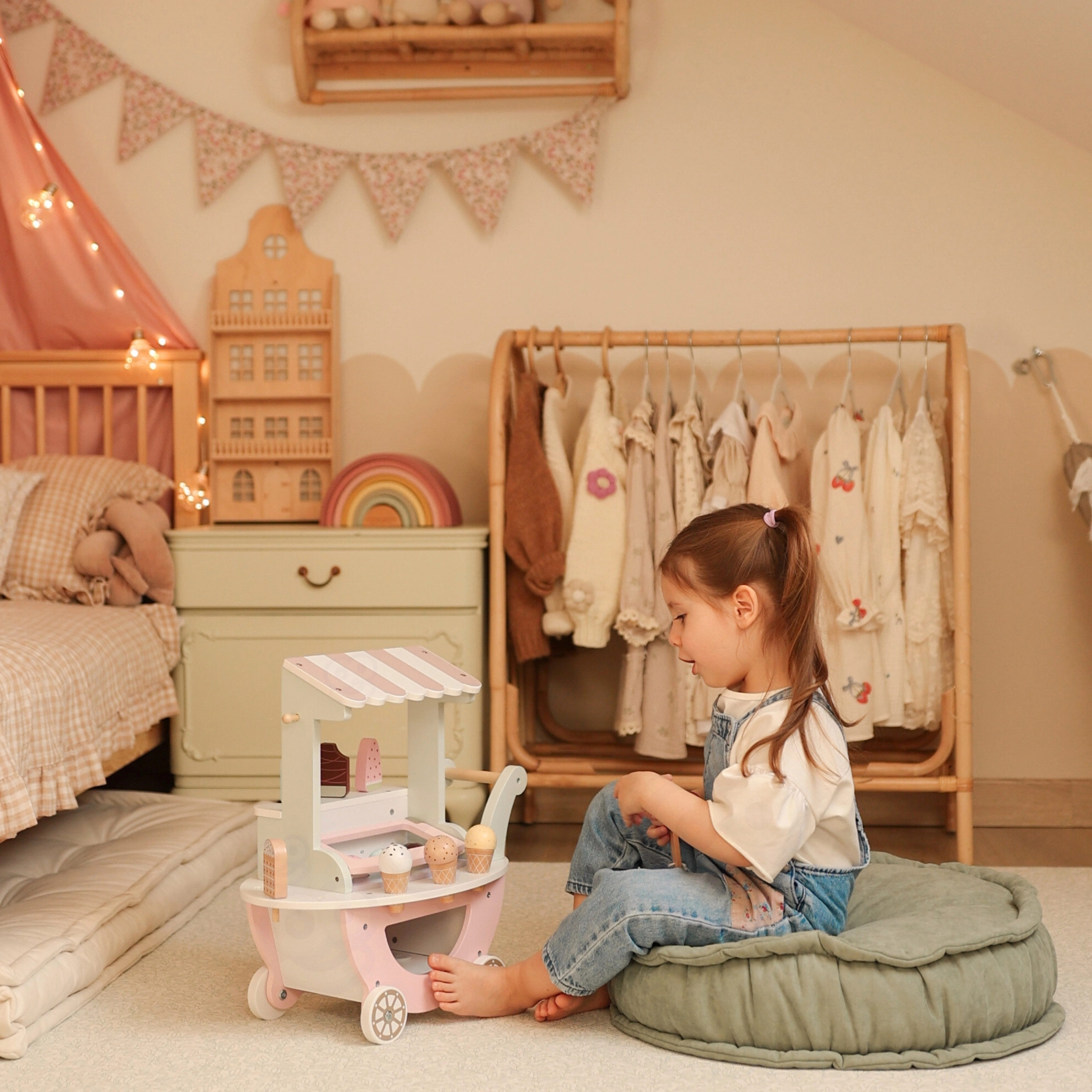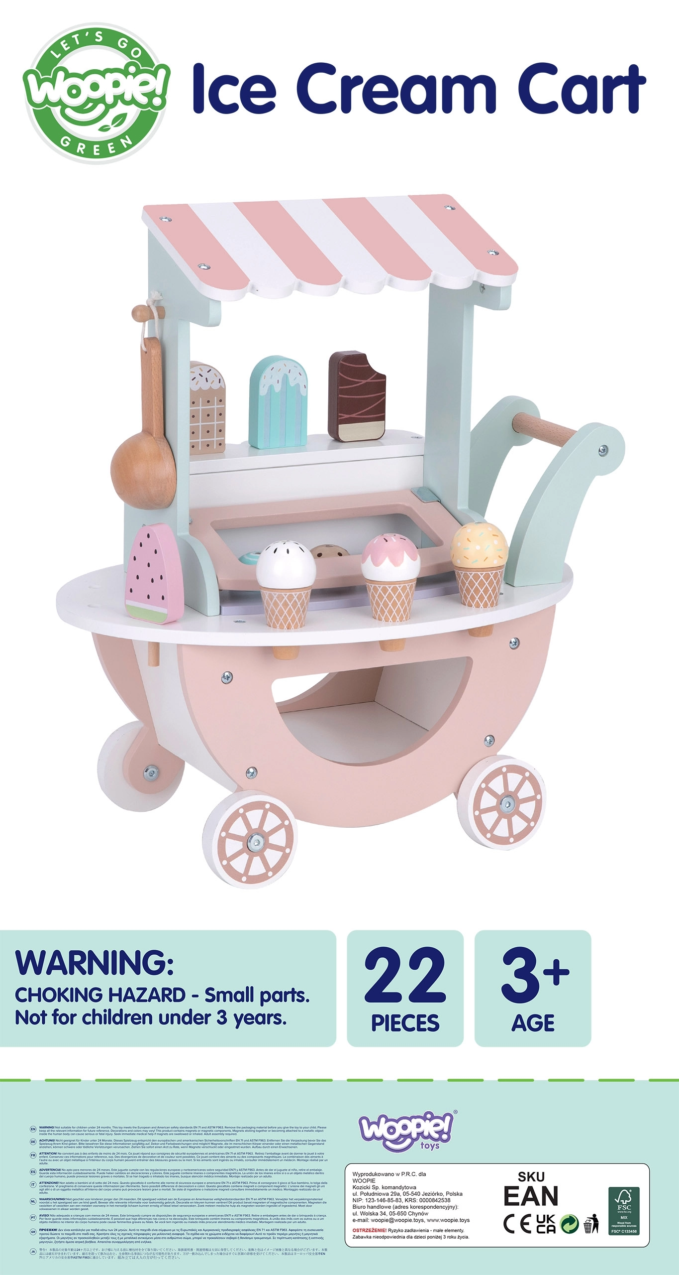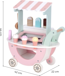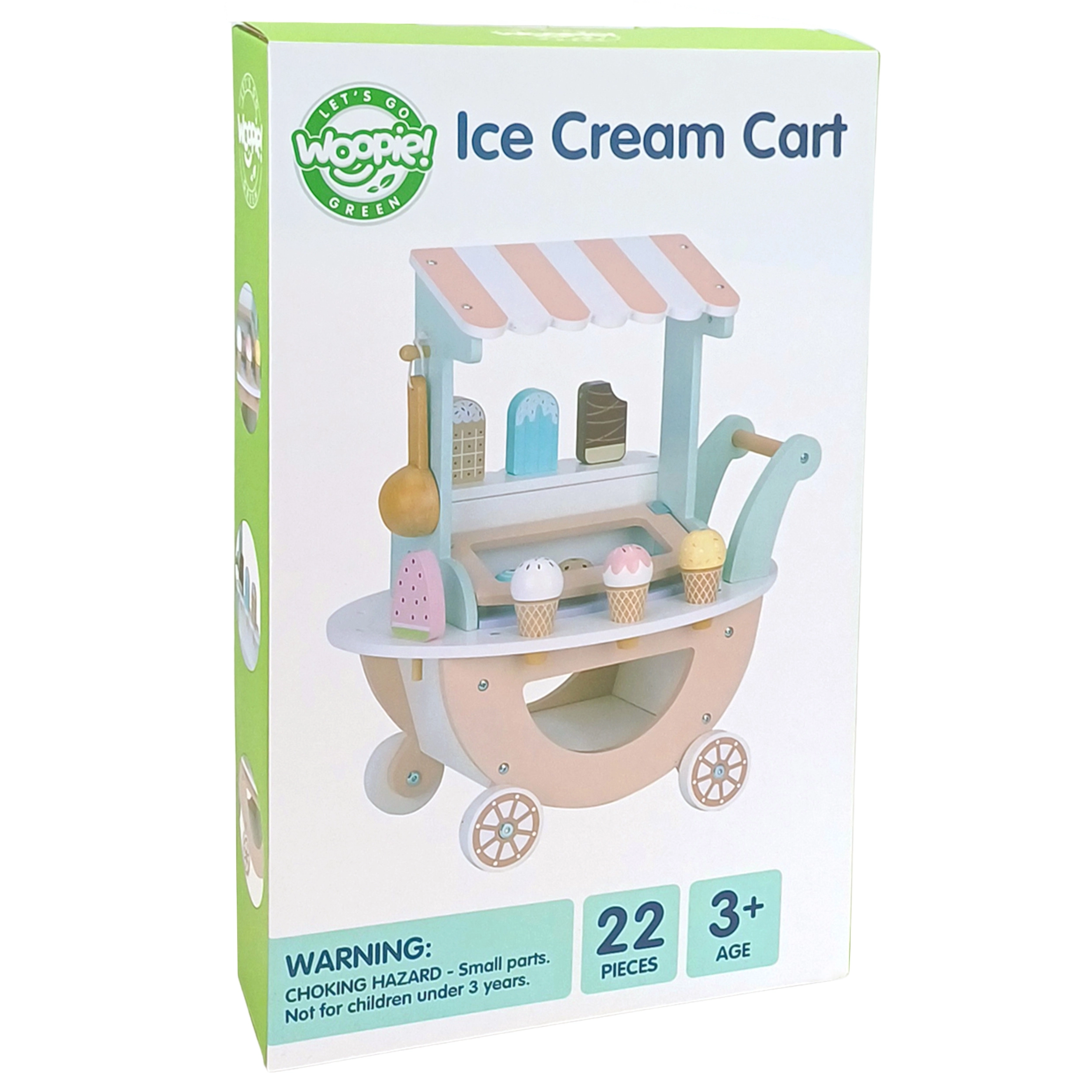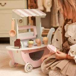 Дървената сладоледена количка Woopie Green не е само красив елемент в нежни пастелни цветове, но и изпълнена с възможности за творческа игра. Вашето дете може да бъде продавач, клиент или дори „сладоледен майстор“ и да създава свои сладоледени чаши според фантазията!