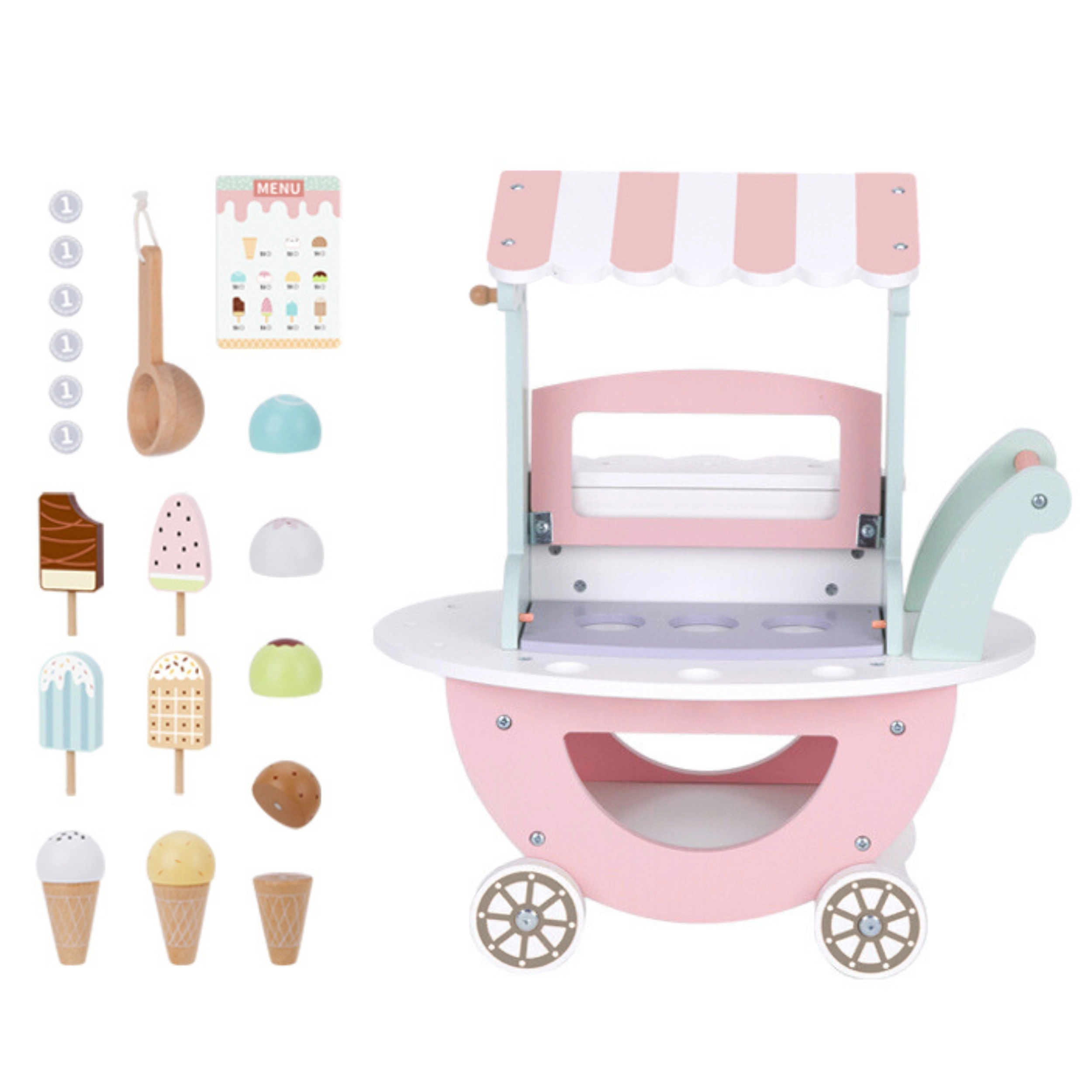 Представяме дървената сладоледена количка Woopie Green – перфектният инструмент за креативна и забавна игра на вашите деца! Тази красива количка е оборудвана с 27 различни аксесоара, които насърчават въображението и ролевите игри.