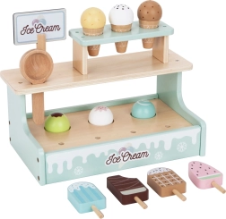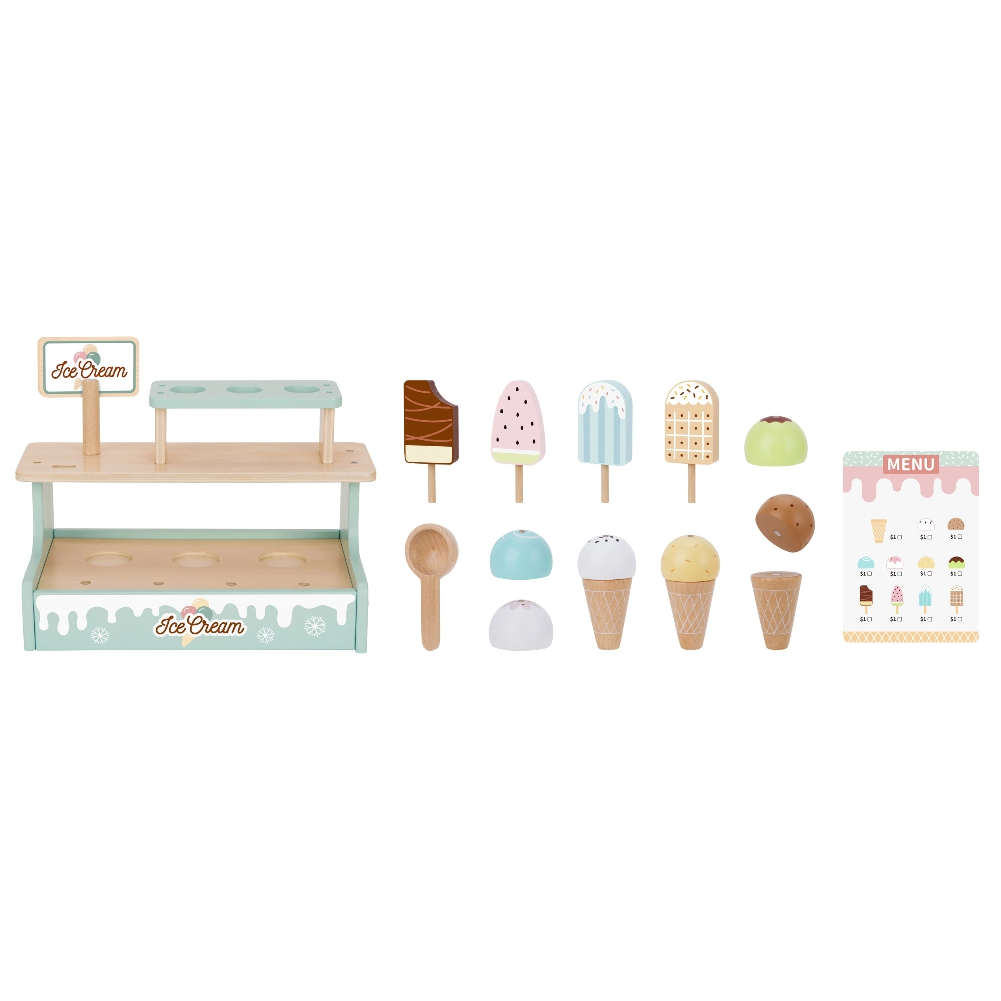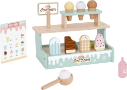 Двуетажният стойка, фунийки, ескимо сладоледи, лъжица за сервиране и меню приканват към реалистично обслужване и развиват социални умения.
