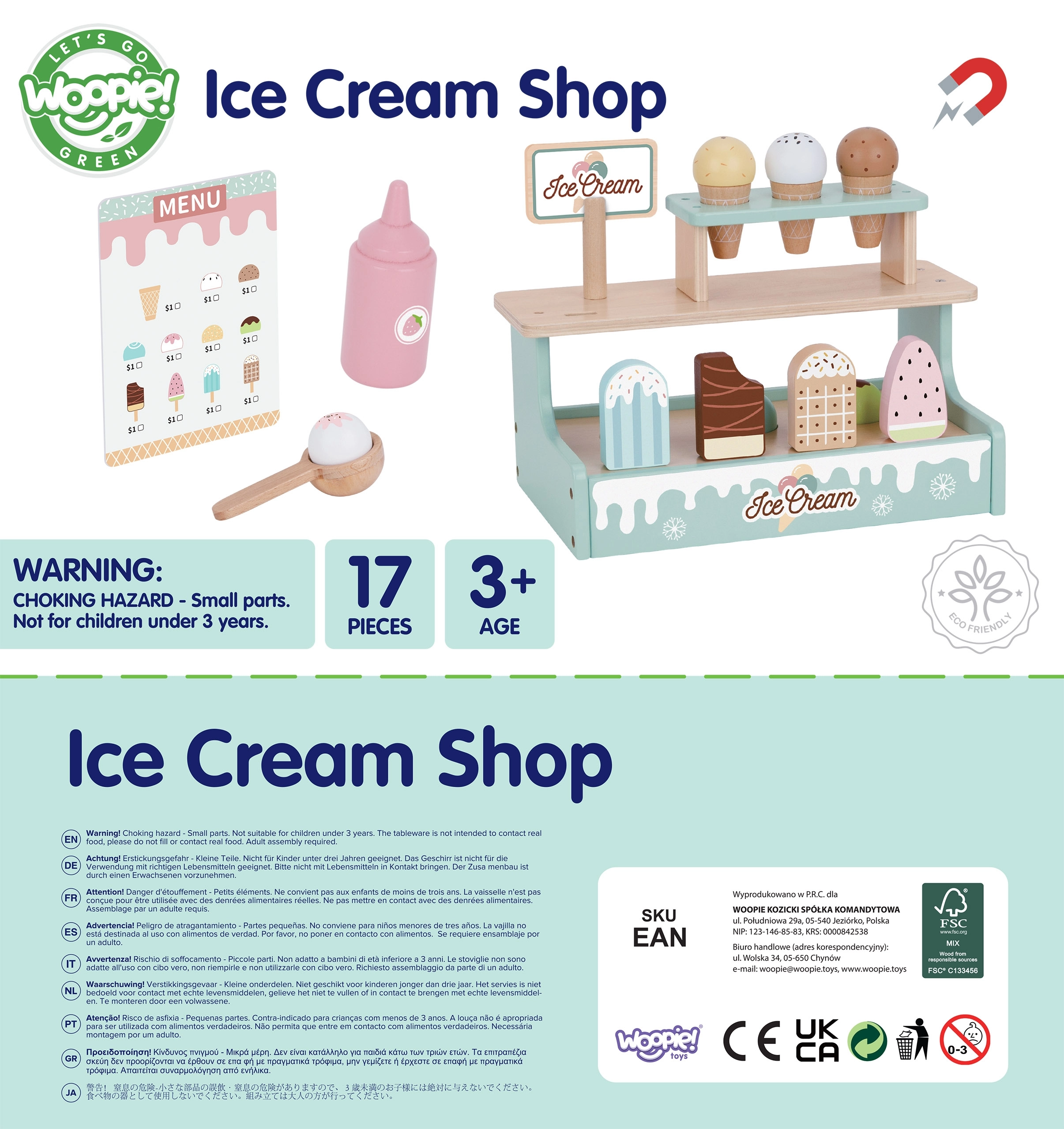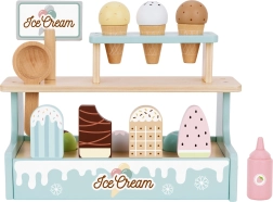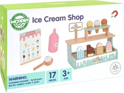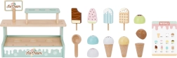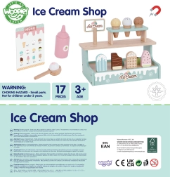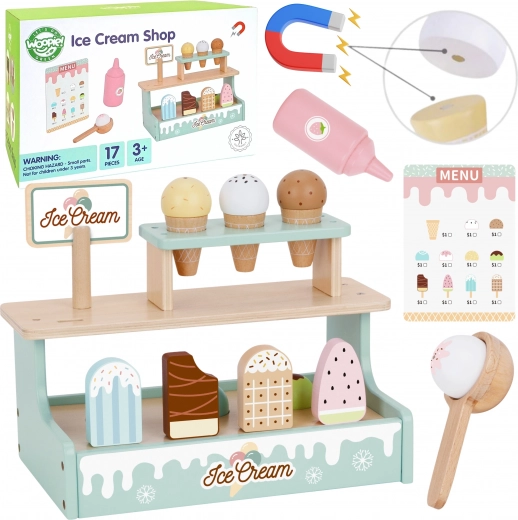 Станете сладоледджия с очарователния дървен щанд WOOPIE GREEN. Пастелен комплект от безопасно дърво предлага фунийки, топки и ескимо сладоледи, магнитно свързване на топките и меню за игра на магазин. Подпомага фината моторика, въображението и ролева игра.