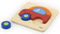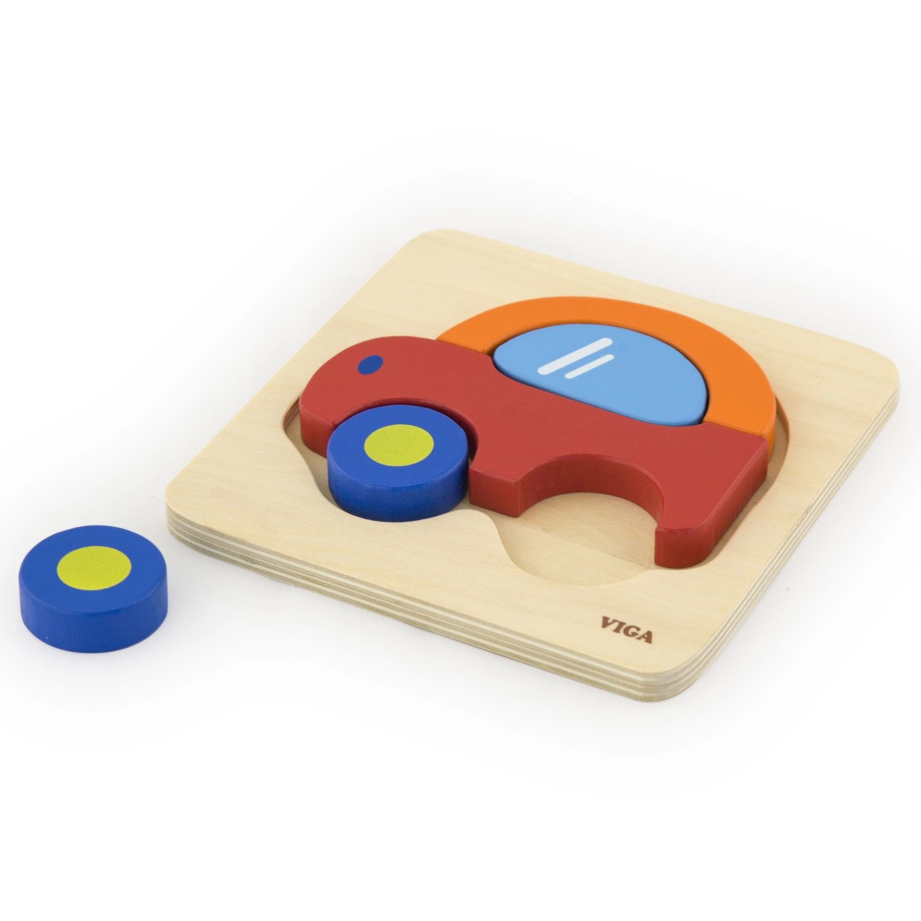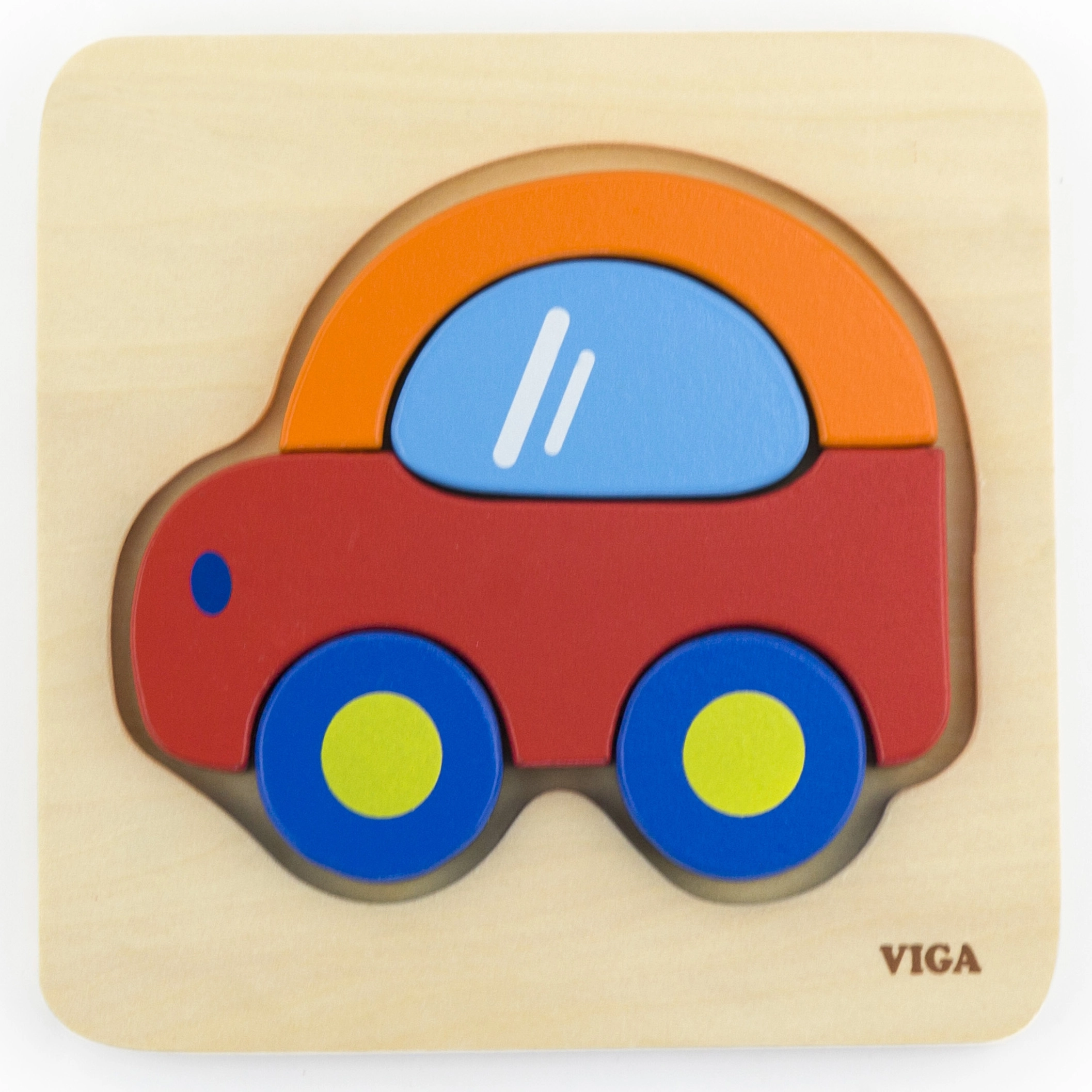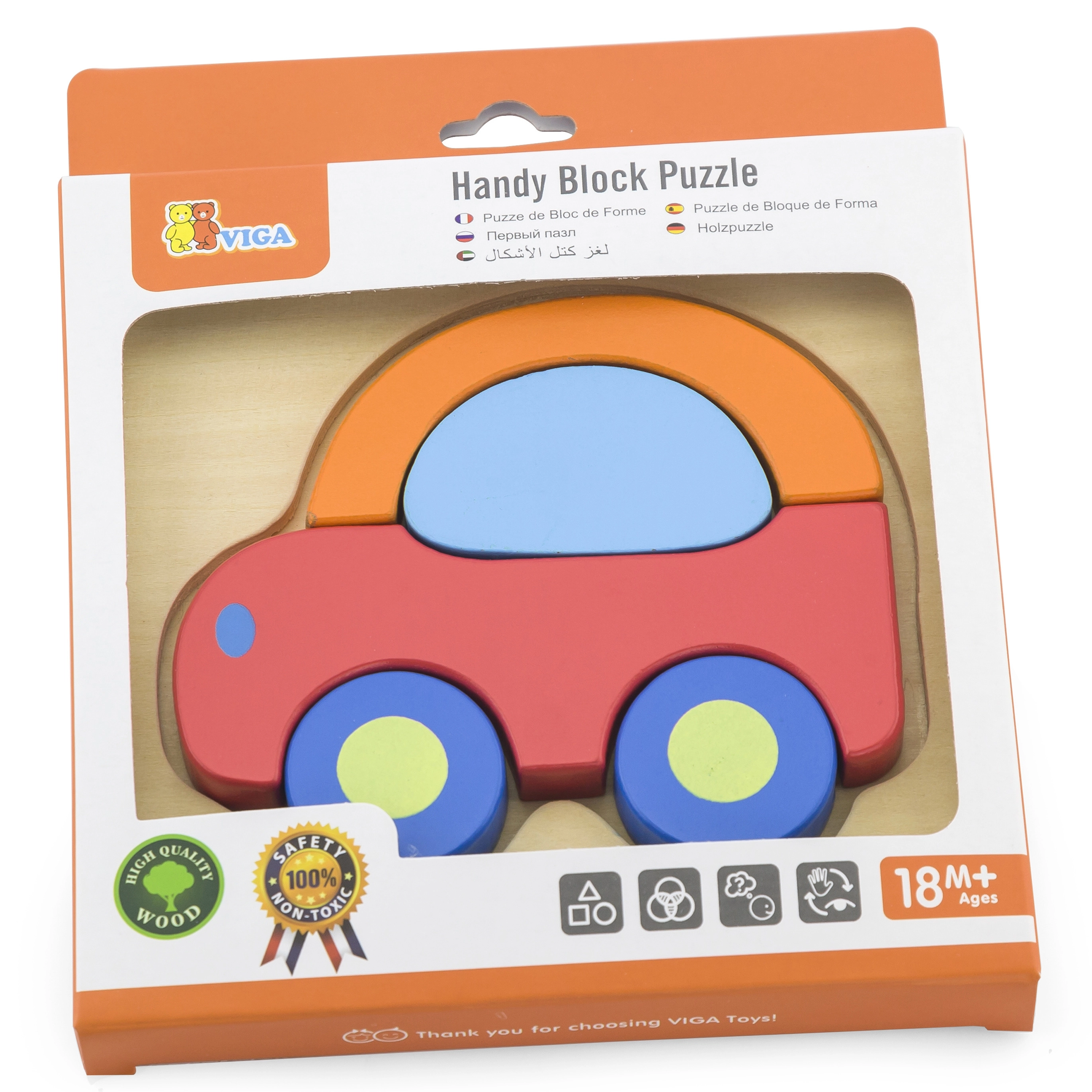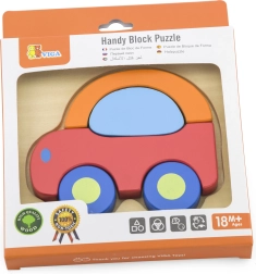 Дървен блоков пъзел във форма на кола от марката VIGA, който предлага издръжливост и привлекателни цветове.