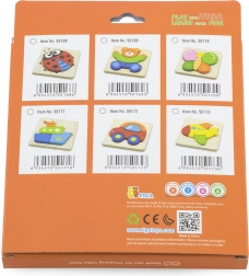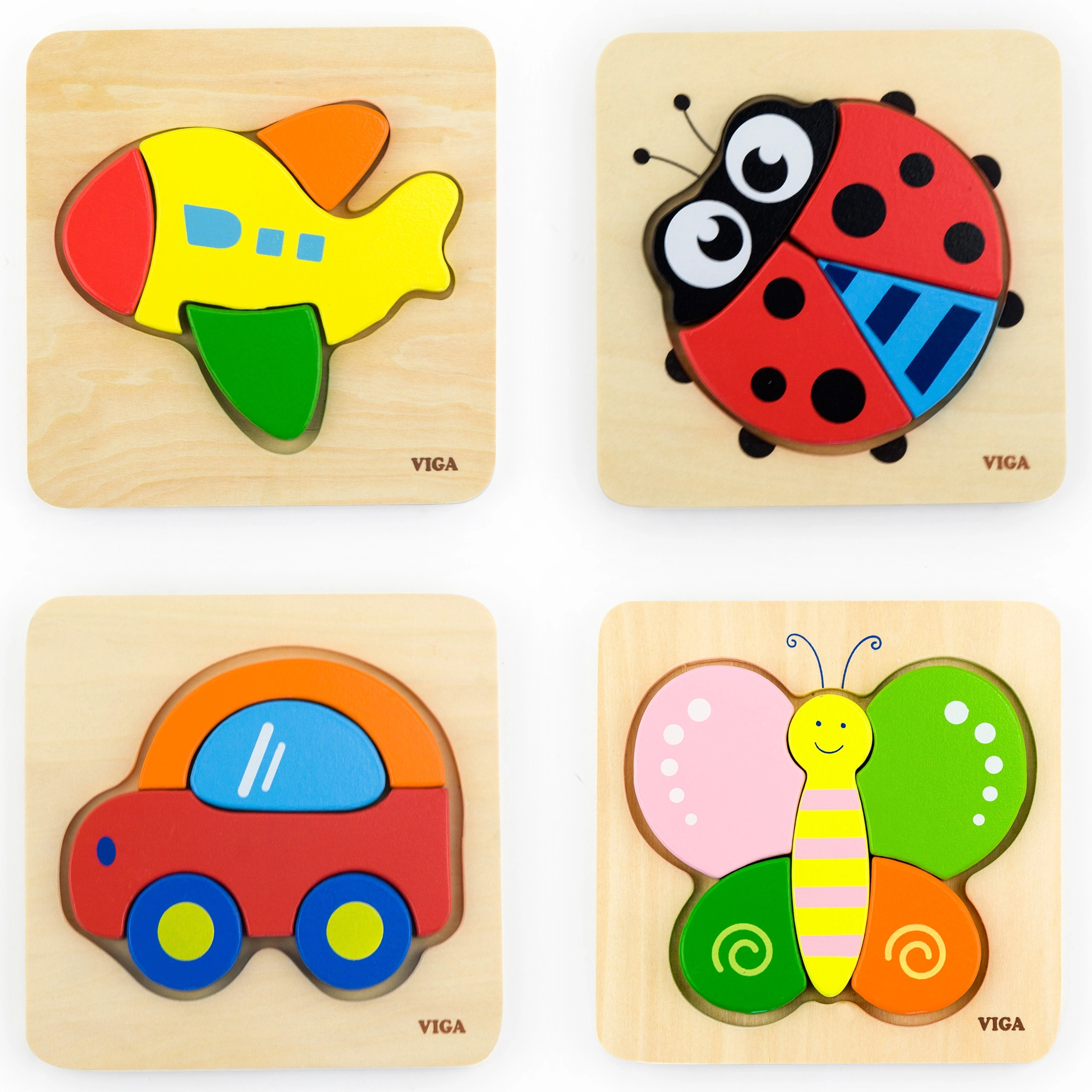 Всеки пъзел има различна форма – самолет, калинка, кола и пеперуда, което развива координацията и познавателните умения.