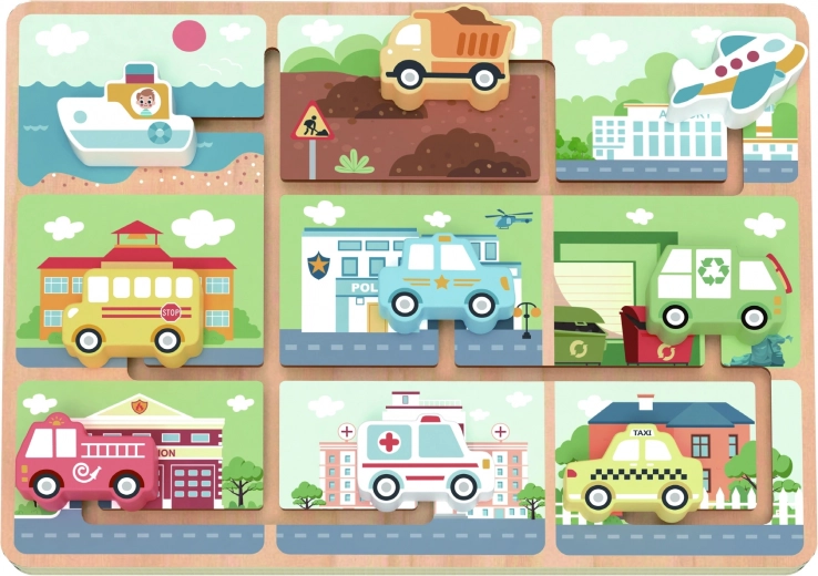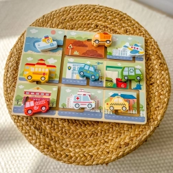 Децата преместват линейка, полицейска кола, автобус или лодка по пътечките и ги поставят в тематичните сцени. Упражняват логическото мислене и обогатяват речника си с названия на превозни средства.