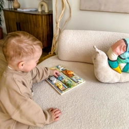 Здрава дървена основа, гладки ръбове и нетоксични бои. Обемните елементи се хващат лесно и подпомагат фината моторика и координацията око–ръка.