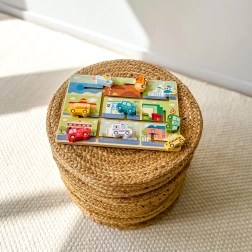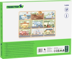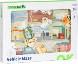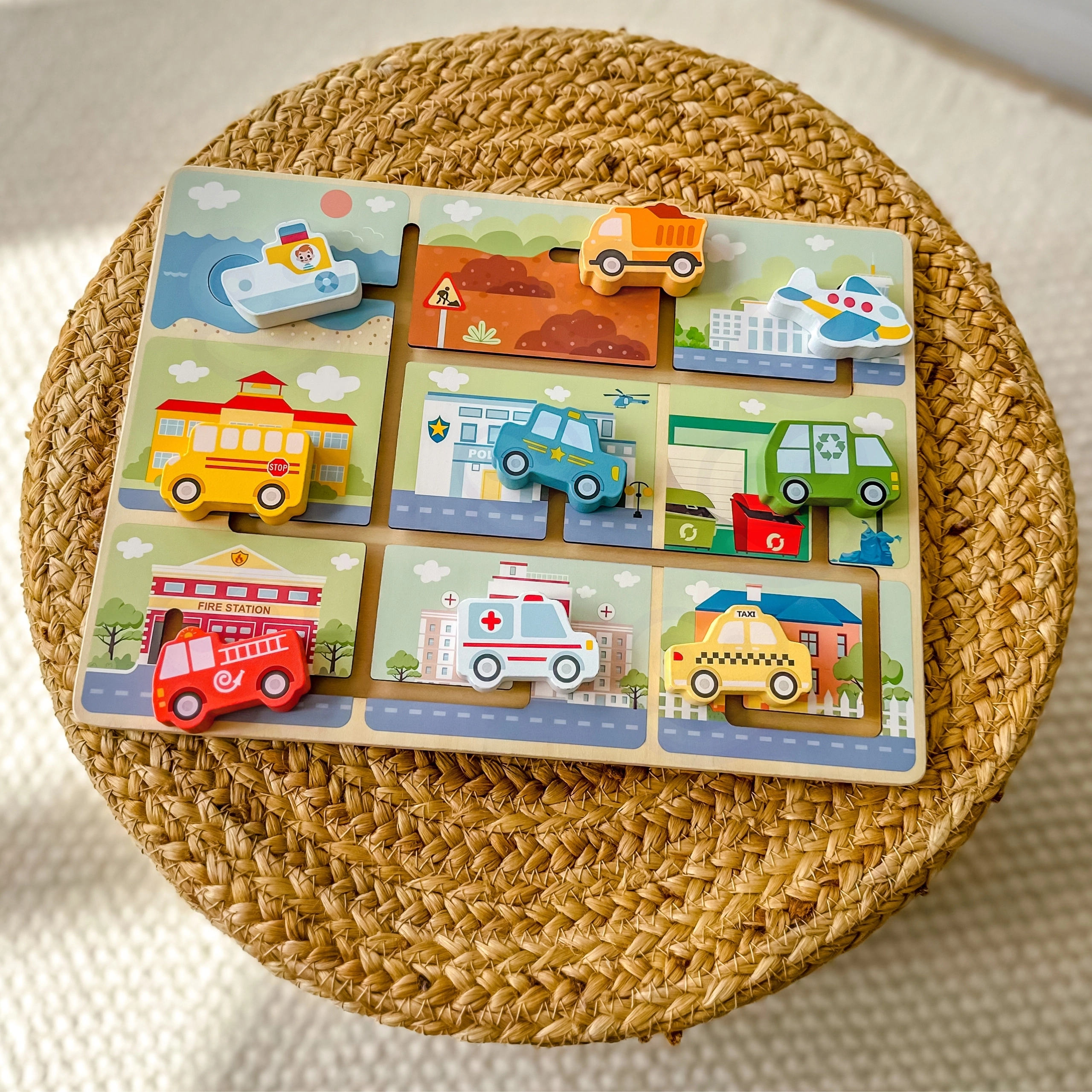 Този качествен дървен лабиринт с градски мотив и превозни средства е идеален избор за деца от 18 месеца. Здрава основа, гладки ръбове и наситени цветове от безопасни, нетоксични бои гарантират сигурно и дълготрайно забавление. Децата преместват отделните части по фрезованите пътечки и се учат къде принадлежат полицейската кола, линейката, училищният автобус, пожарната кола, лодката или самолетът.