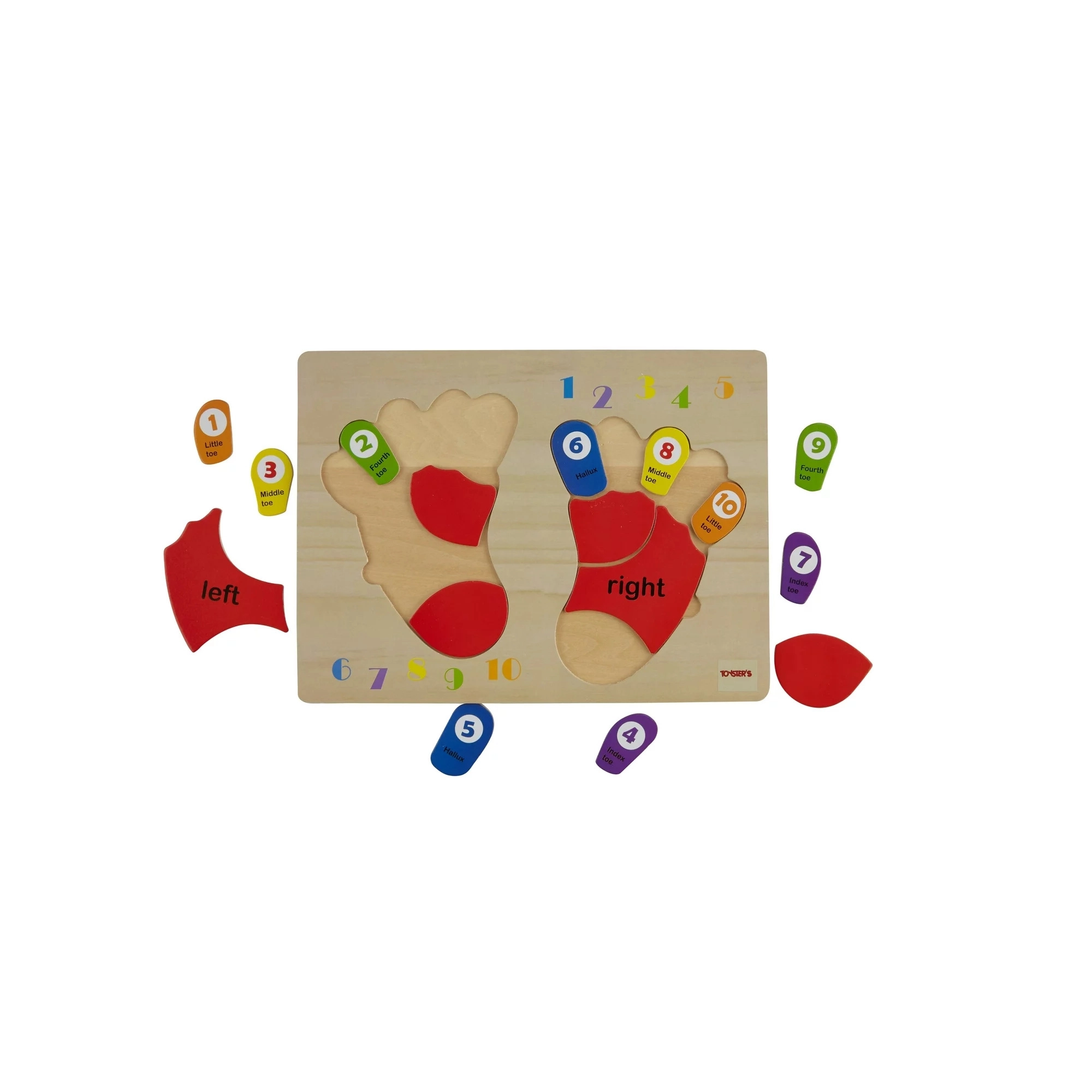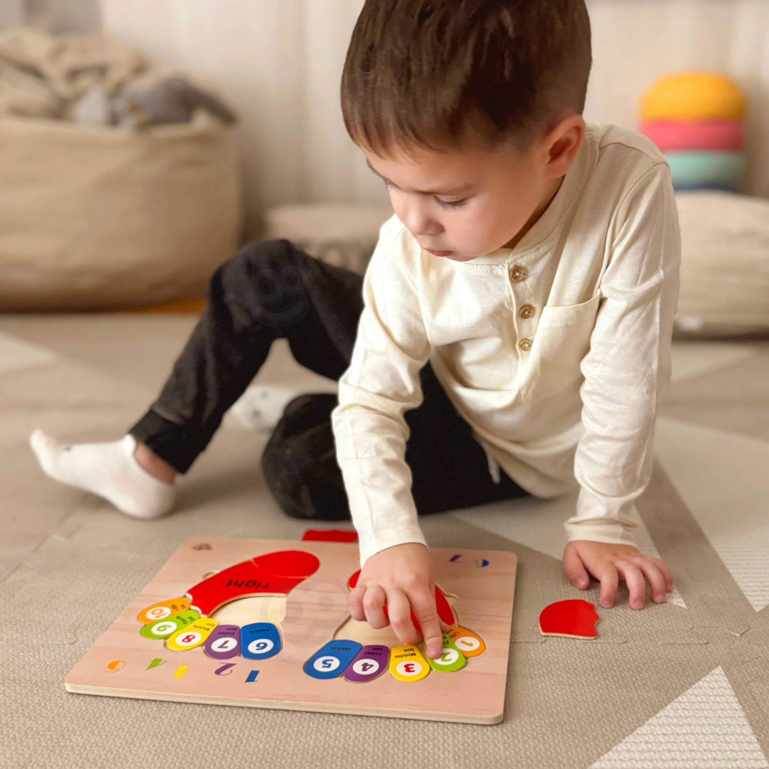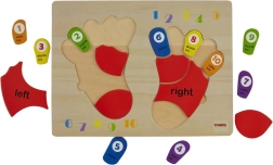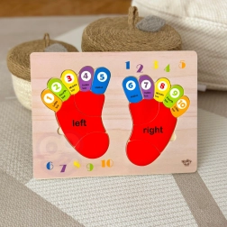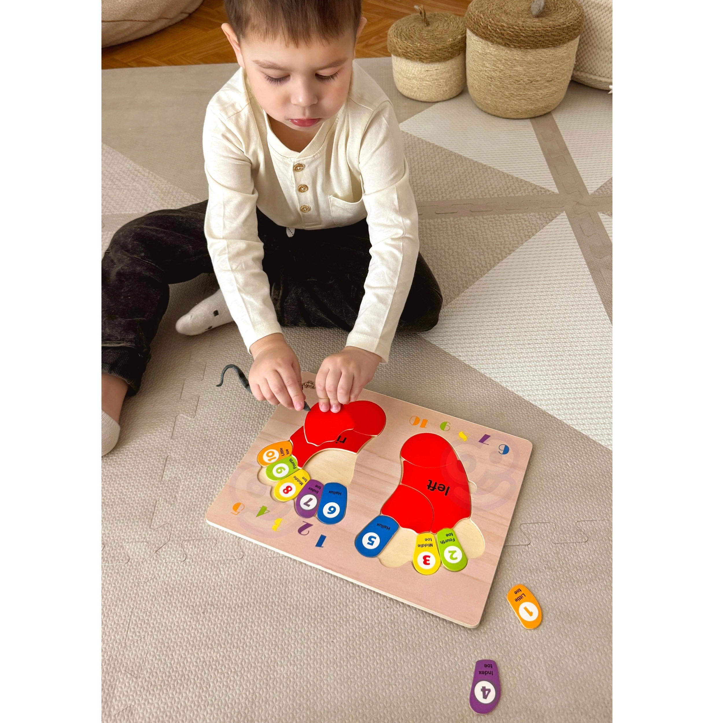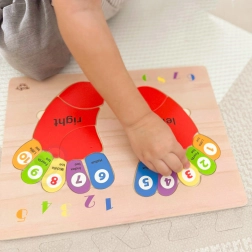 Дървеният пъзел от марката TOOKY TOY е идеален помощник за децата при първите им стъпки в света на математиката. Дъската и всички нейни елементи са изработени от висококачествено дърво и са перфектно съобразени с размера на детските пръсти. Цветните отпечатъци са обозначени със страни: лява и дясна, а на всеки пръст е присвоен номер, което помага на децата да пренасят наученото към броене на собствените си пръсти.