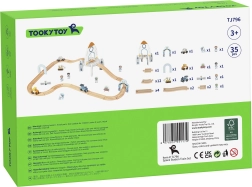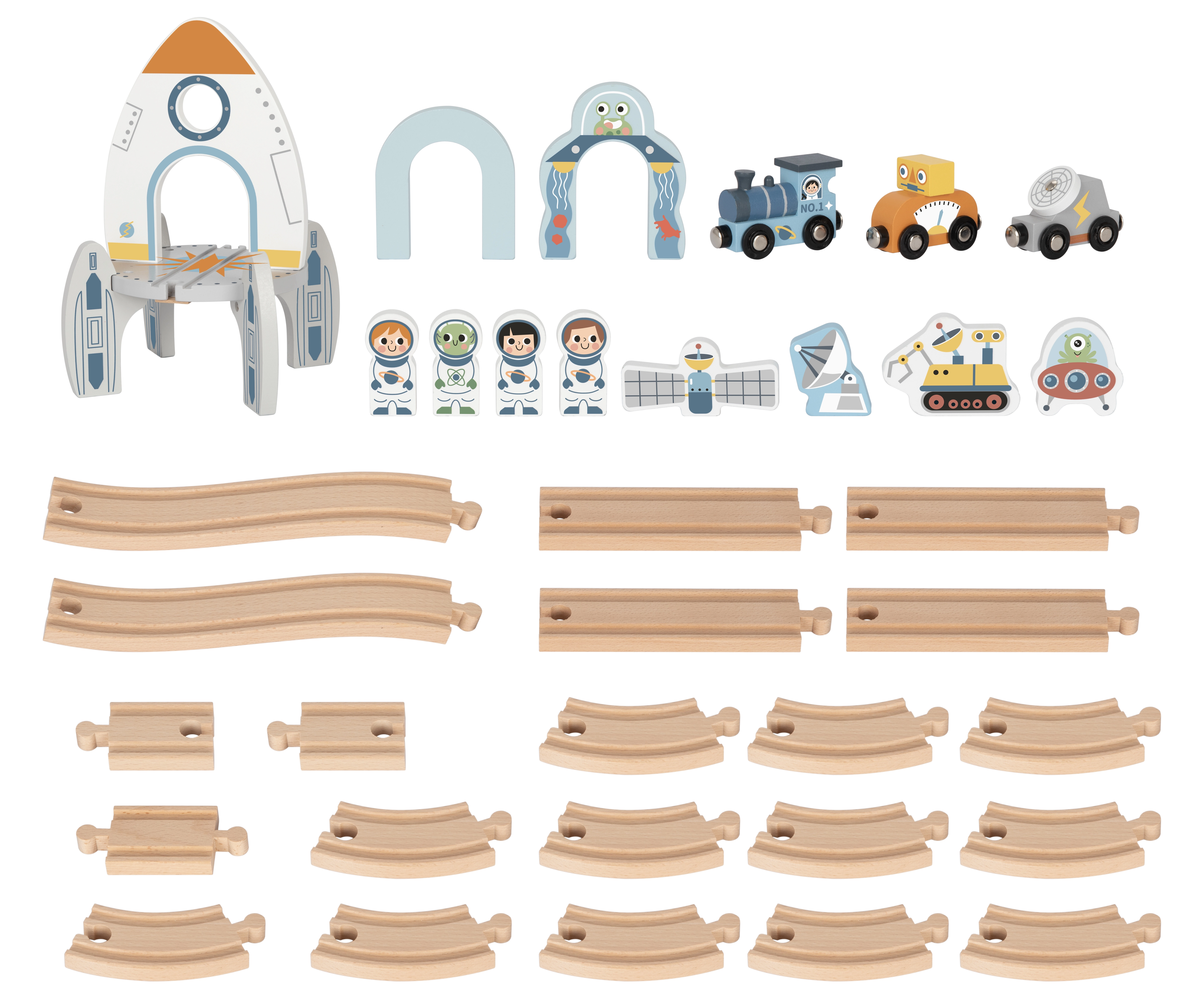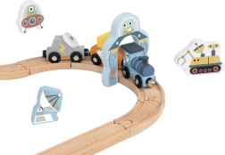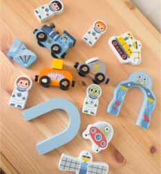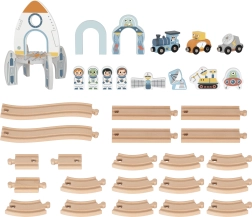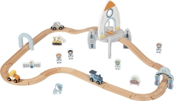 Тази дървена космическа влакова писта въвежда децата в света на Космоса с тематични елементи като фигурки на астронавти, космическа сонда, роувър и летяща чиния. Многоетажното разположение на релсите придава динамика на играта. Централният елемент на пистата е голямата космическа ракета, която служи както като декоративен, така и като конструктивен елемент.