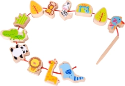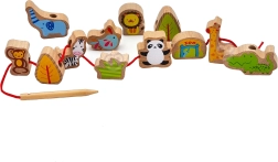 Включва 12 дървени мъниста и връв с дървена игла. Гладките ръбове и удобният размер осигуряват комфортна и безопасна употреба.