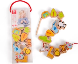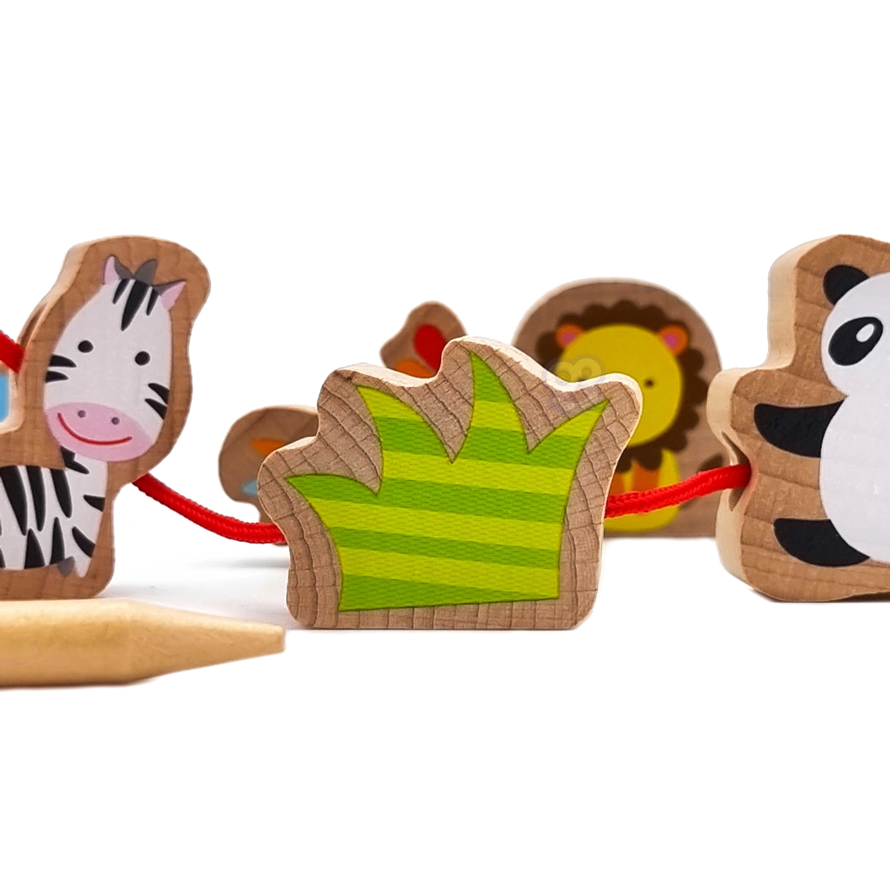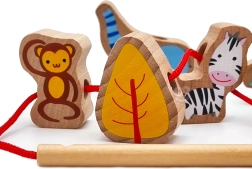 Нанизването на дървените мъниста на връв с игла развива прецизния захват, координацията око–ръка и търпението – идеална тренировка за малки пръстчета.