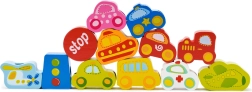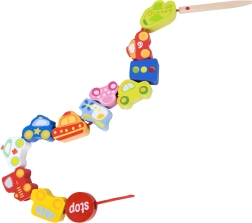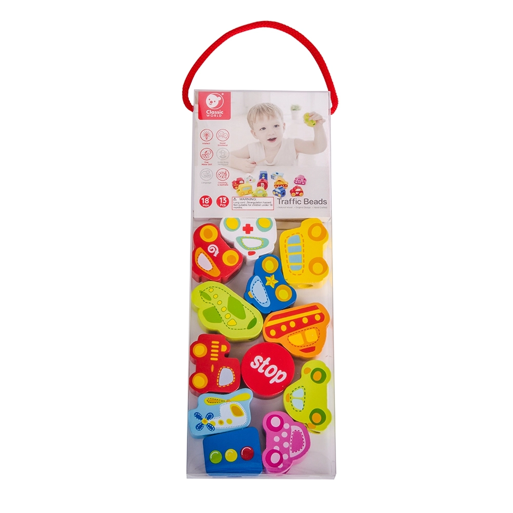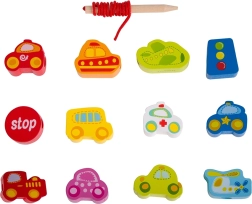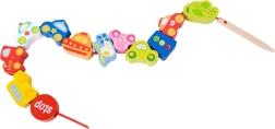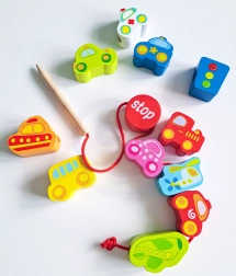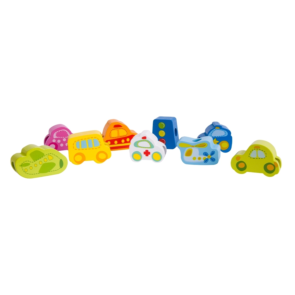 Открийте умна играчка, която съчетава учене и забавление. Дървените мъниста във форма на коли, автобус, самолет и пътни знаци лесно се нанизват на връв с дървен накрайник. Докато играят, децата упражняват фината моторика, прецизността на движенията и разпознаването на цветове и форми.