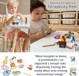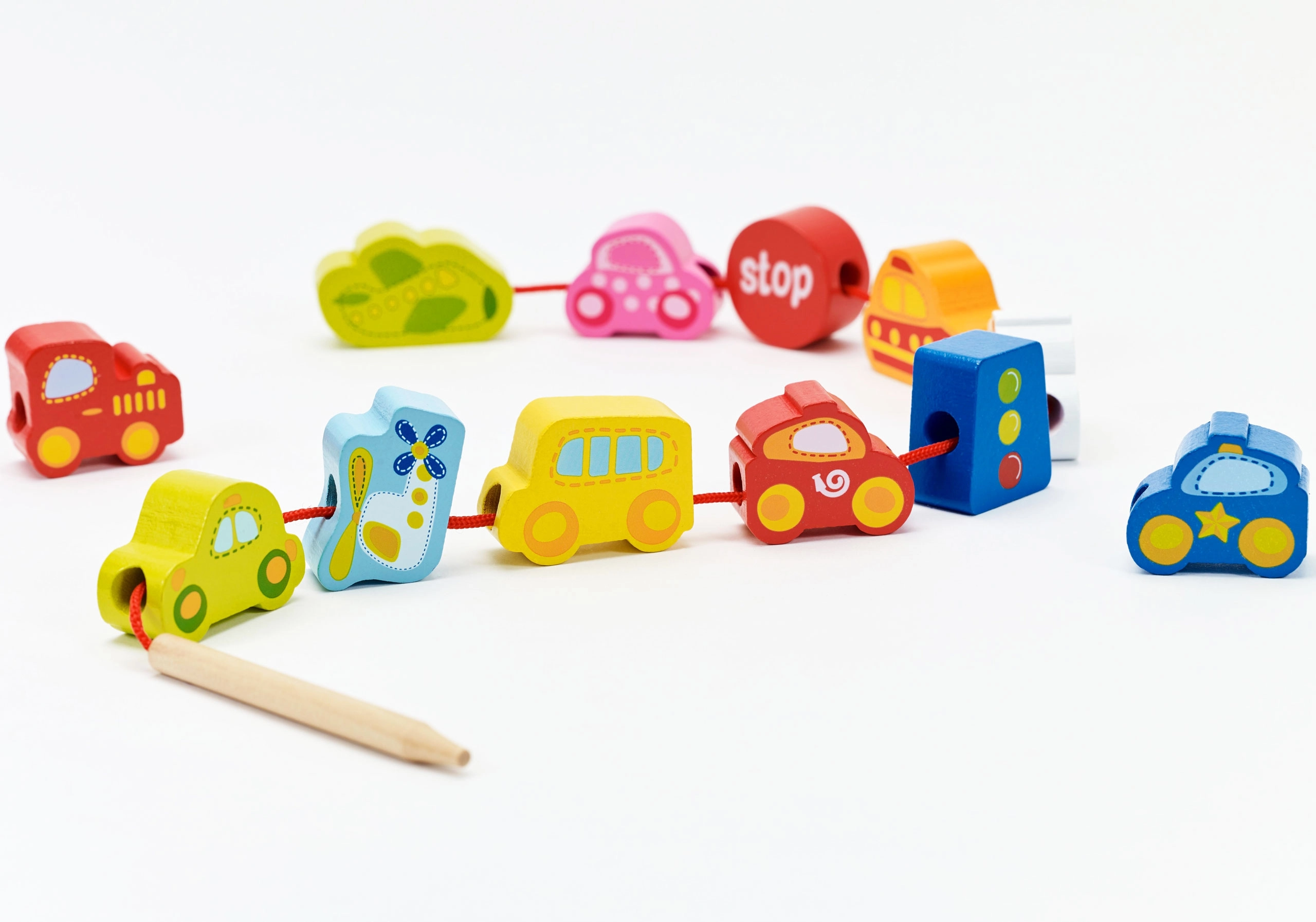 Нанизването на дървените елементи на връв с дървен накрайник подобрява координацията око–ръка, захвата и концентрацията – забавен път към уменията за ежедневието.