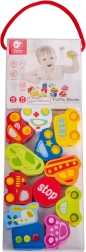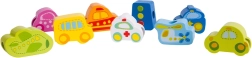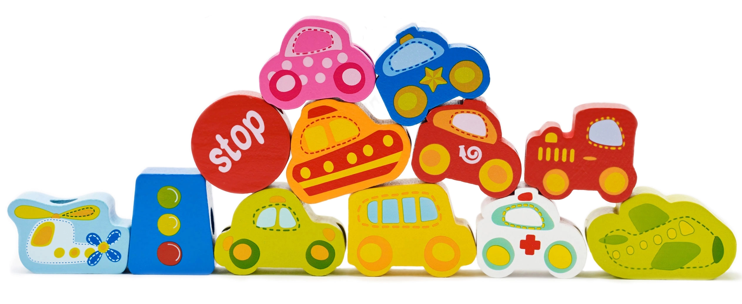 Цветните превозни средства и пътните знаци запознават децата със света на пътя. При подреждане на последователността на мънистата упражняват цветовете, формите и основните правила за движение.