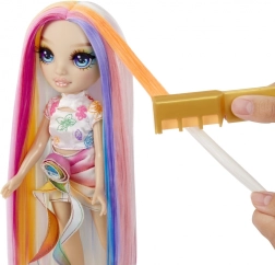 Стани малък фризьор с куклата Rainbow High Amaya и създавай безкрайни прически благодарение на екстра дългата дъгова коса и кредата за оцветяване. В комплекта има пет гребена с цветни кредички, за да можеш да оцветиш, изплакнеш и започнеш отново – без бъркотия и винаги когато ти хрумне нов стил.