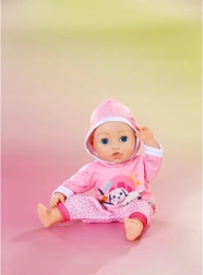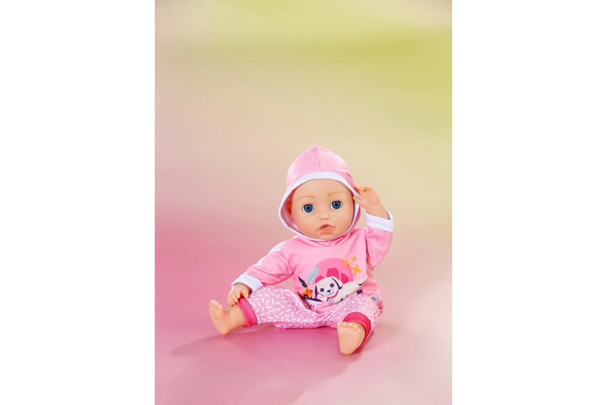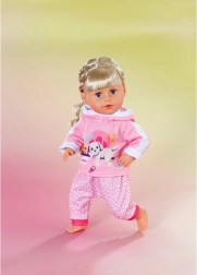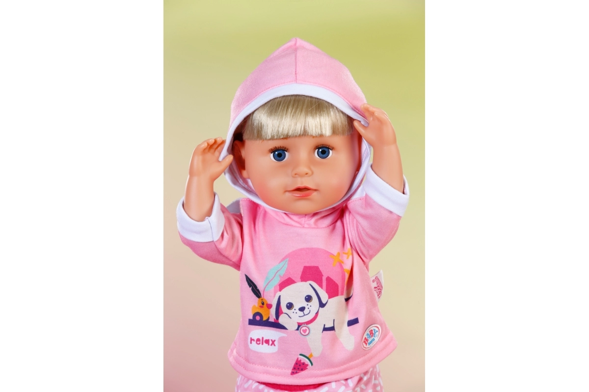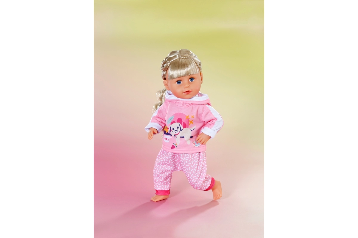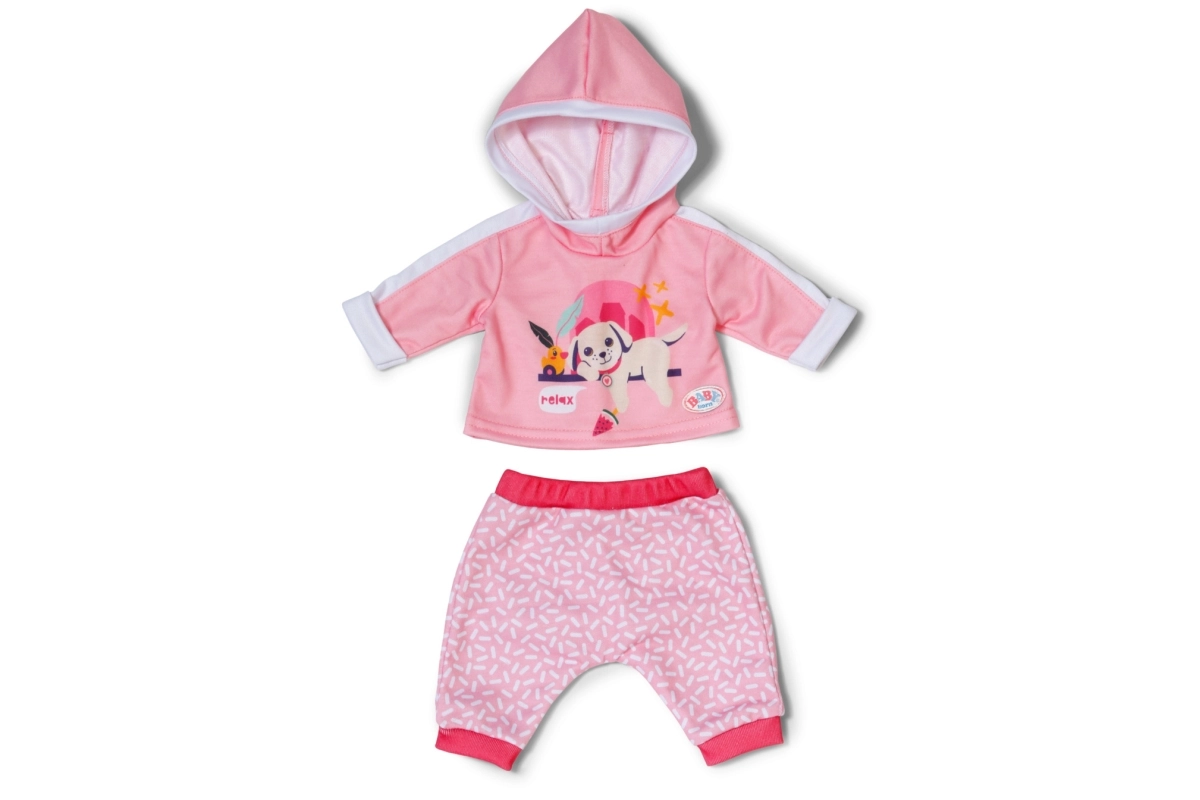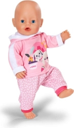 Този розов анцуг е перфектно допълнение към гардероба на куклите BABY born 43 см и на мечетата BABY born Teddy. Суичърът с очарователна щампа на отпочиващо кученце и приятните панталони с фин десен гарантират комфорт при всяко приключение. Благодарение на добре обмислената кройка облеклото се облича и съблича лесно.